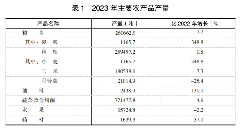种植面积:全年农作物种植面积82.7千公顷。粮食种植面积64.2千公顷。其中:夏粮种植面积0.2千公顷,秋粮种植面积64.0千公顷。蔬菜种植面积13.4千公顷。药材种植面积0.4千公顷。