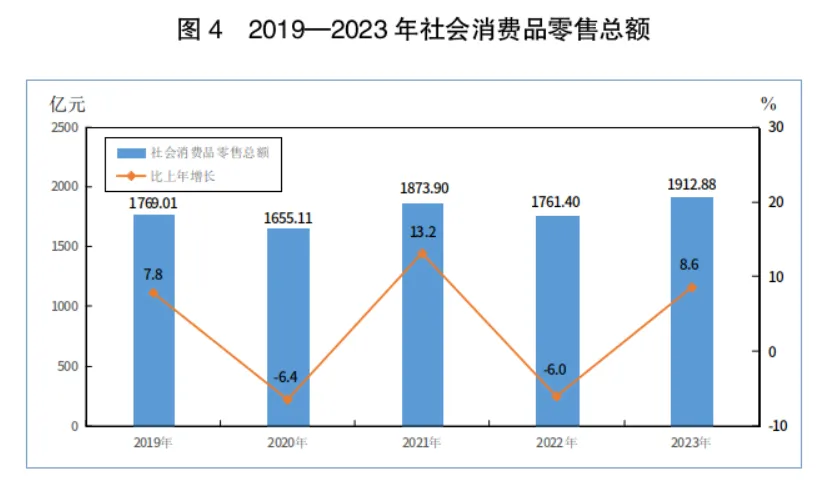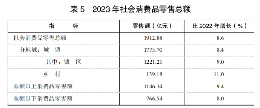 消费品零售:全年社会消费品零售总额1912.88亿元,比上年增长8.6%。其中:城镇社会消费品零售总额1773.70亿元,增长8.4%;乡村社会消费品零售总额139.18亿元,增长11.0%。