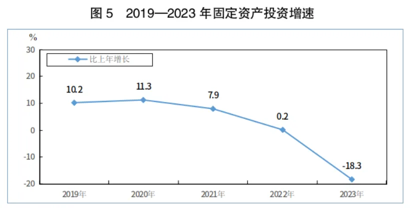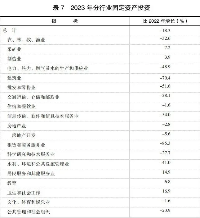 固定资产投资:全年固定资产投资比上年下降18.3%。其中:央属项目投资下降19.1%,地方项目投资下降20.1%,其他项目投资下降15.5%。