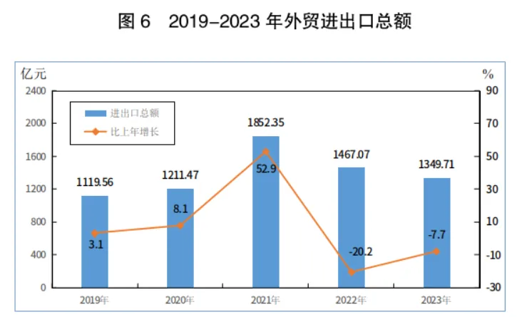 进出口贸易:全年外贸进出口总额1349.71亿元,比上年下降7.7%。其中:出口额826.94亿元,下降14.6%;进口额522.77亿元,增长5.6%。