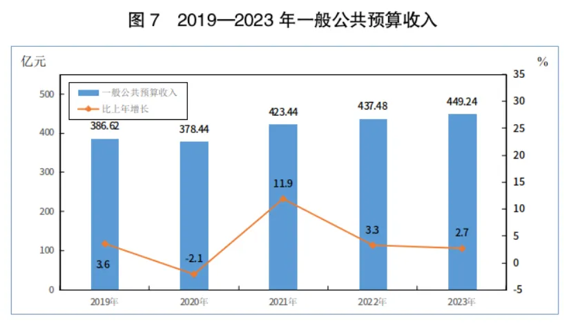 财政:一般公共预算收入449.24亿元,比上年增长2.7%,其中:税收收入336.34亿元,增长1.2%;非税收入112.9亿元,增长7.4%。