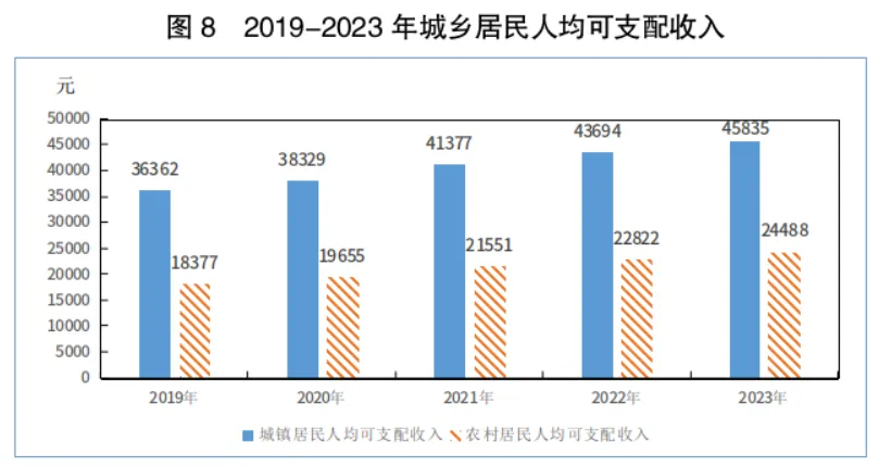 居民收入消费:全年居民人均可支配收入42685元,比上年增长5.1%。按常住地分,城镇居民人均可支配收入45835元,增长4.9%,农村居民人均可支配收入24488元,增长7.3%。城乡居民收入比为1.87:1。