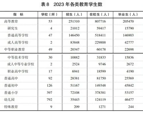 教育:年末共有普通高等院校53所(其中高职院校19所),成人高等学校2所,中等职业教育学校49所,普通高中92所,普通初中126所,小学397所,幼儿园792所。
