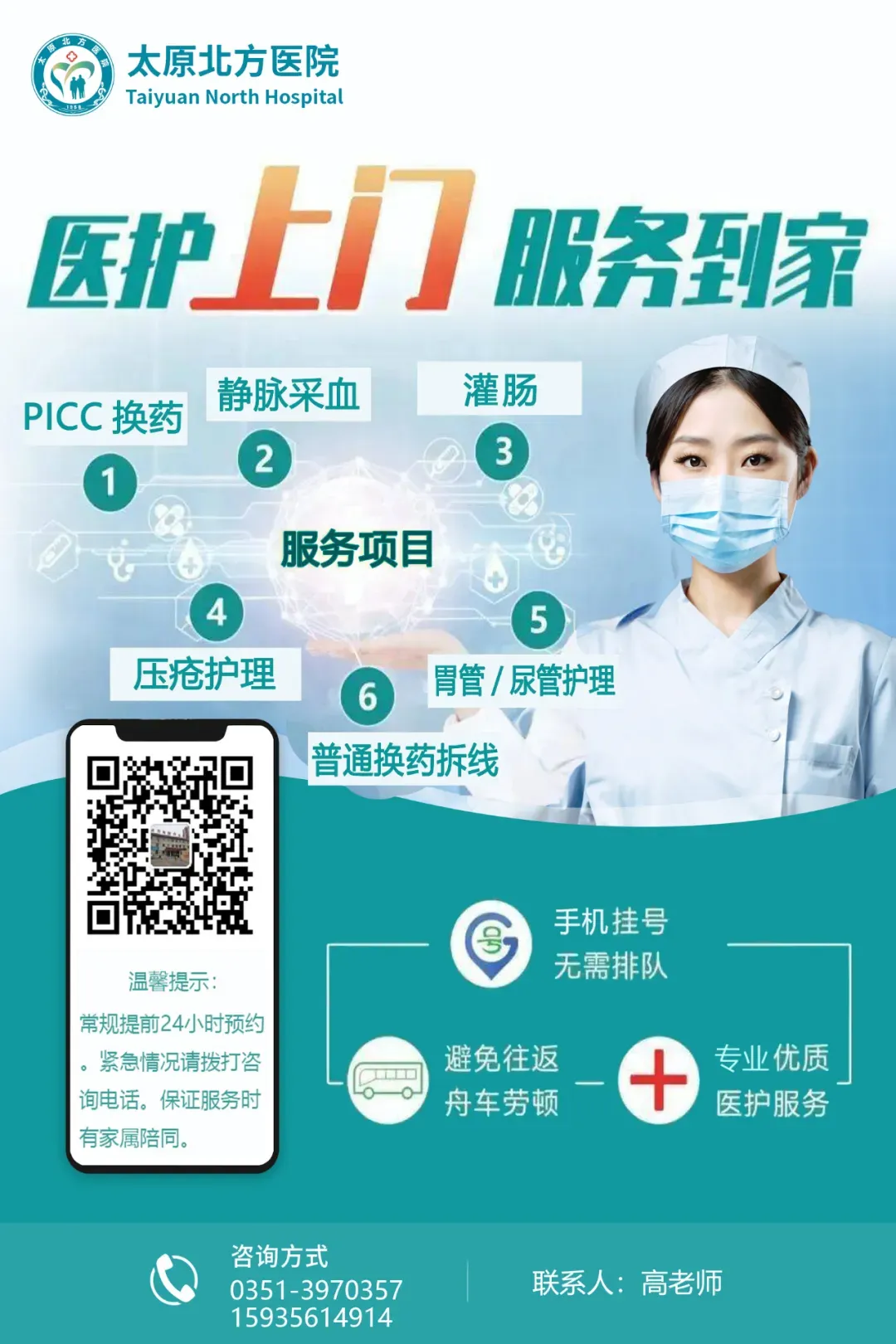 李大娘的经历并非个例。如今,太原北方医院“互联网+护理服务”已覆盖多项核心护理项目——鼻胃管更换、导尿管更换、经外周静脉置入中心静脉导管(PICC)维护、伤口护理、造口护理……无论你是常年卧床的老人,还是行动不便的患者,无需辗转医院,不用排队等候,一个电话或一次线上预约,专业医护人员就会带着齐全的设备上门服务,用扎实的专业技能和贴心的照料,为你撑起健康屏障。