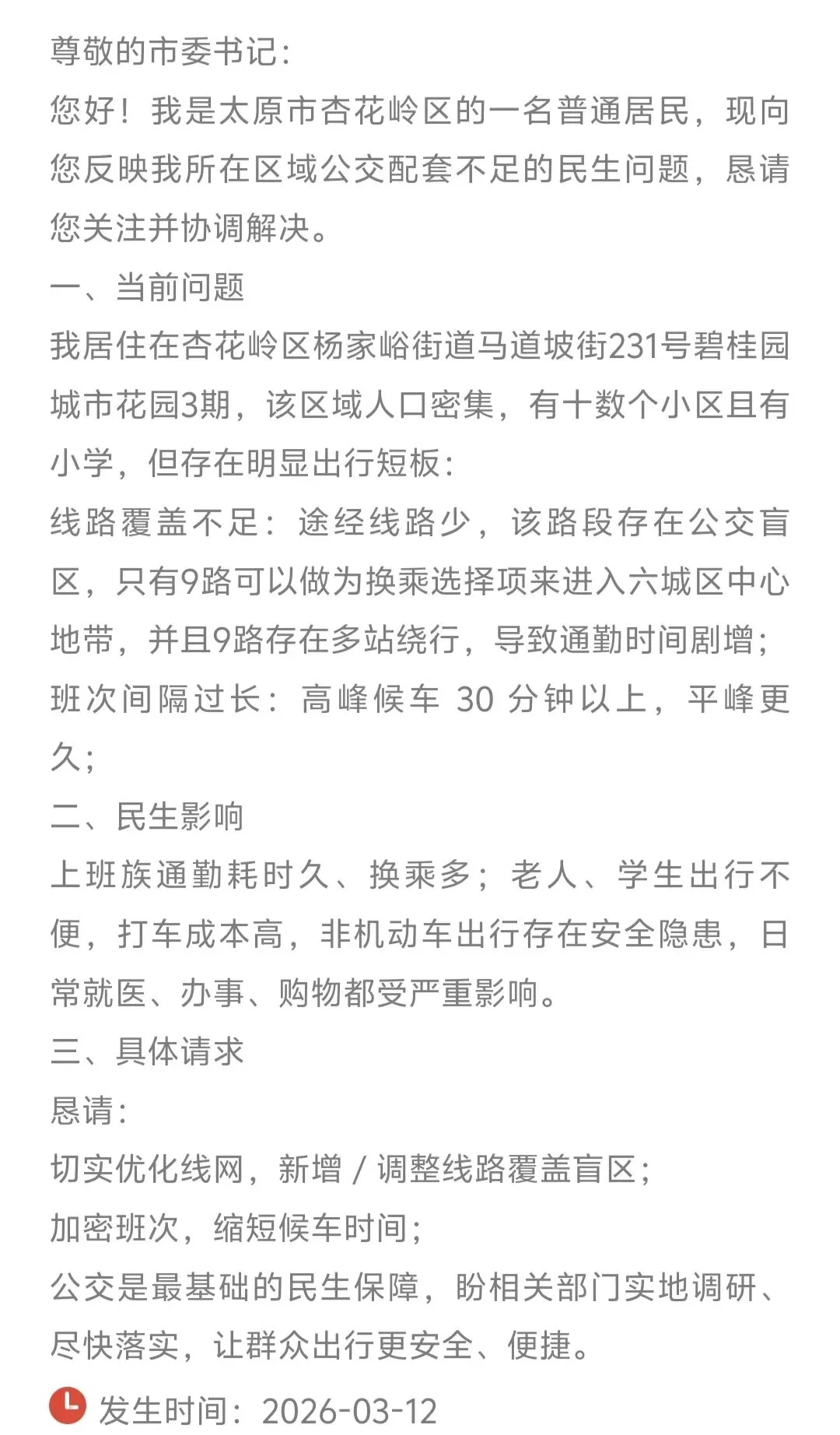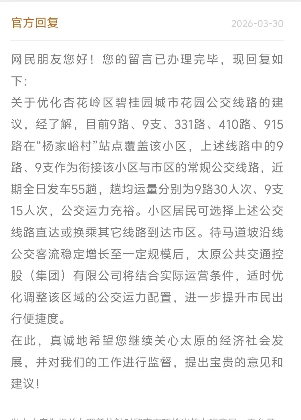 针对居民反映的问题,太原公共交通控股(集团)有限公司于2026年3月30日作出回应。