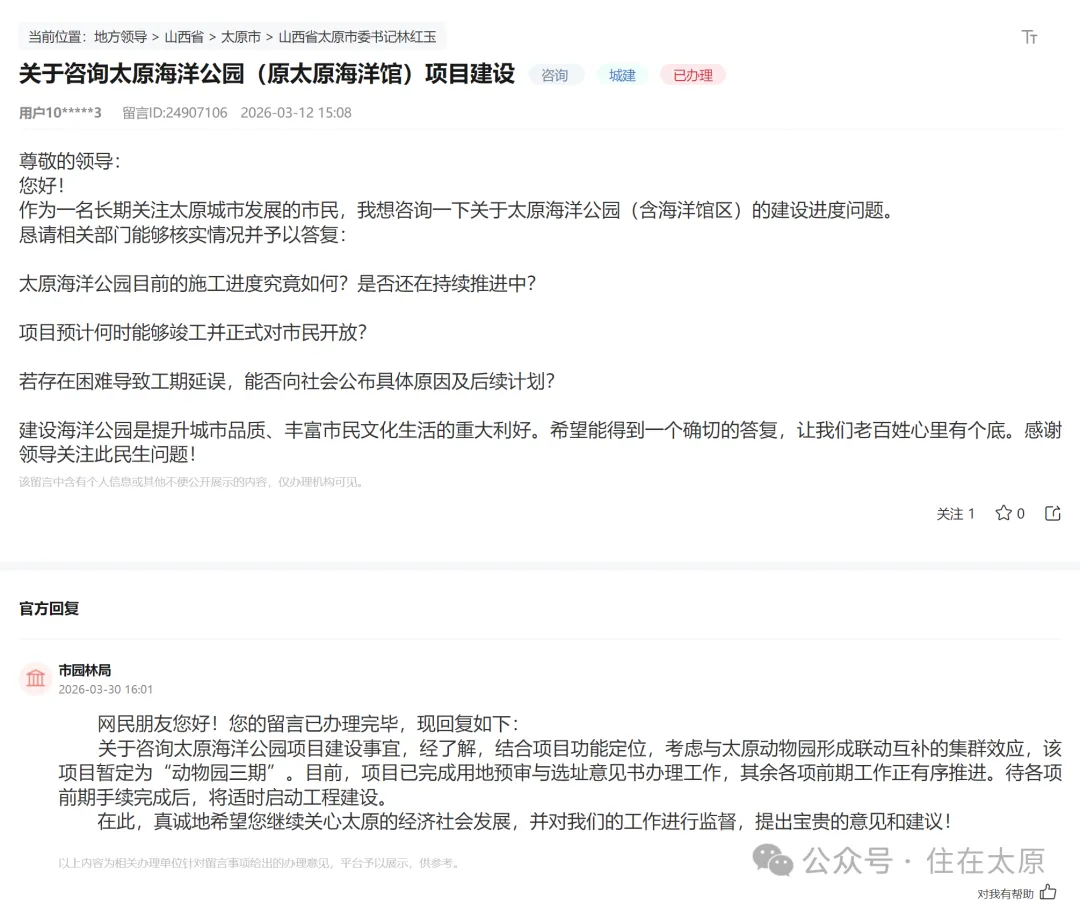 官方回复称:经了解,结合项目功能定位,考虑与太原动物园形成联动互补的集群效应,该项目暂定为“动物园三期”。目前,项目已完成用地预审与选址意见书办理工作,其余各项前期工作正有序推进。待各项前期手续完成后,将适时启动工程建设。