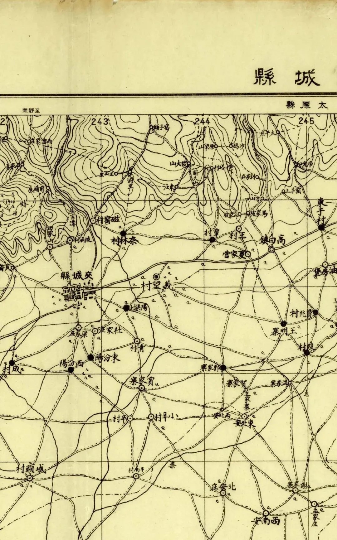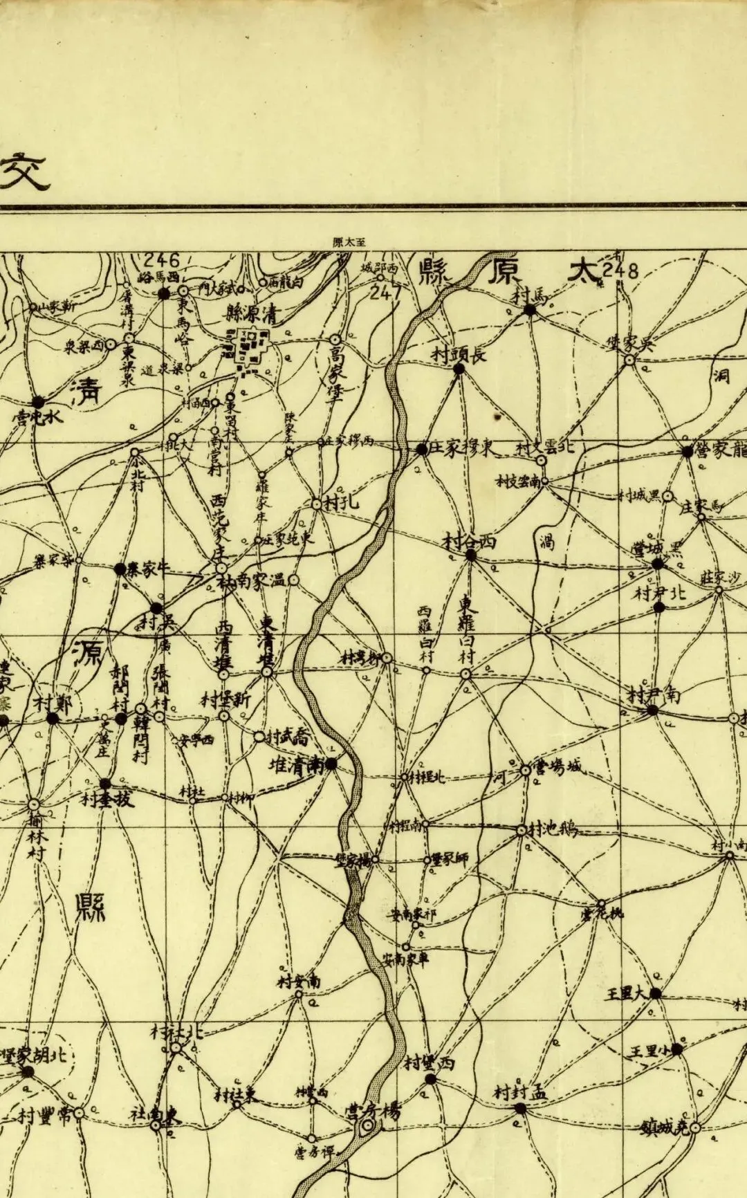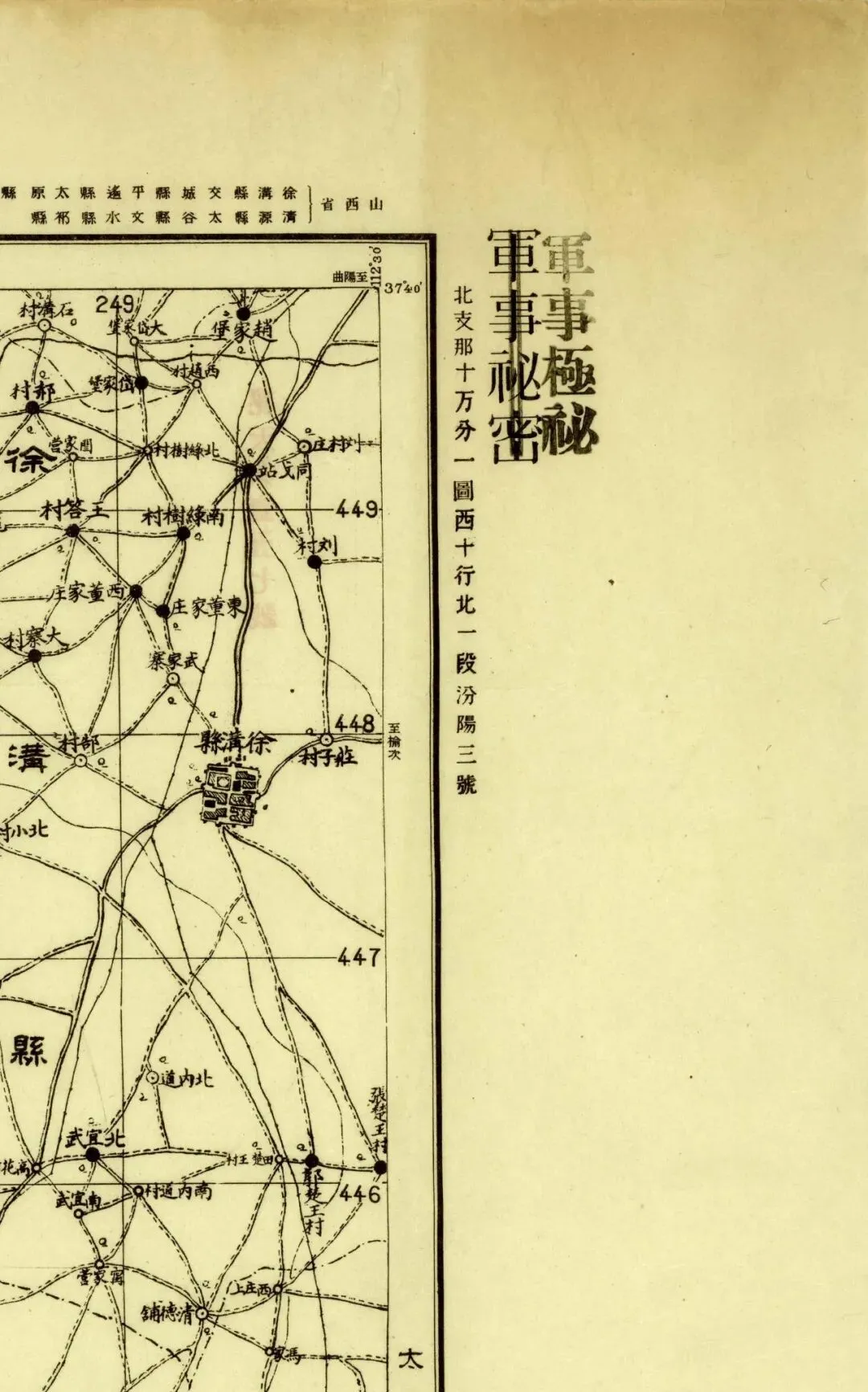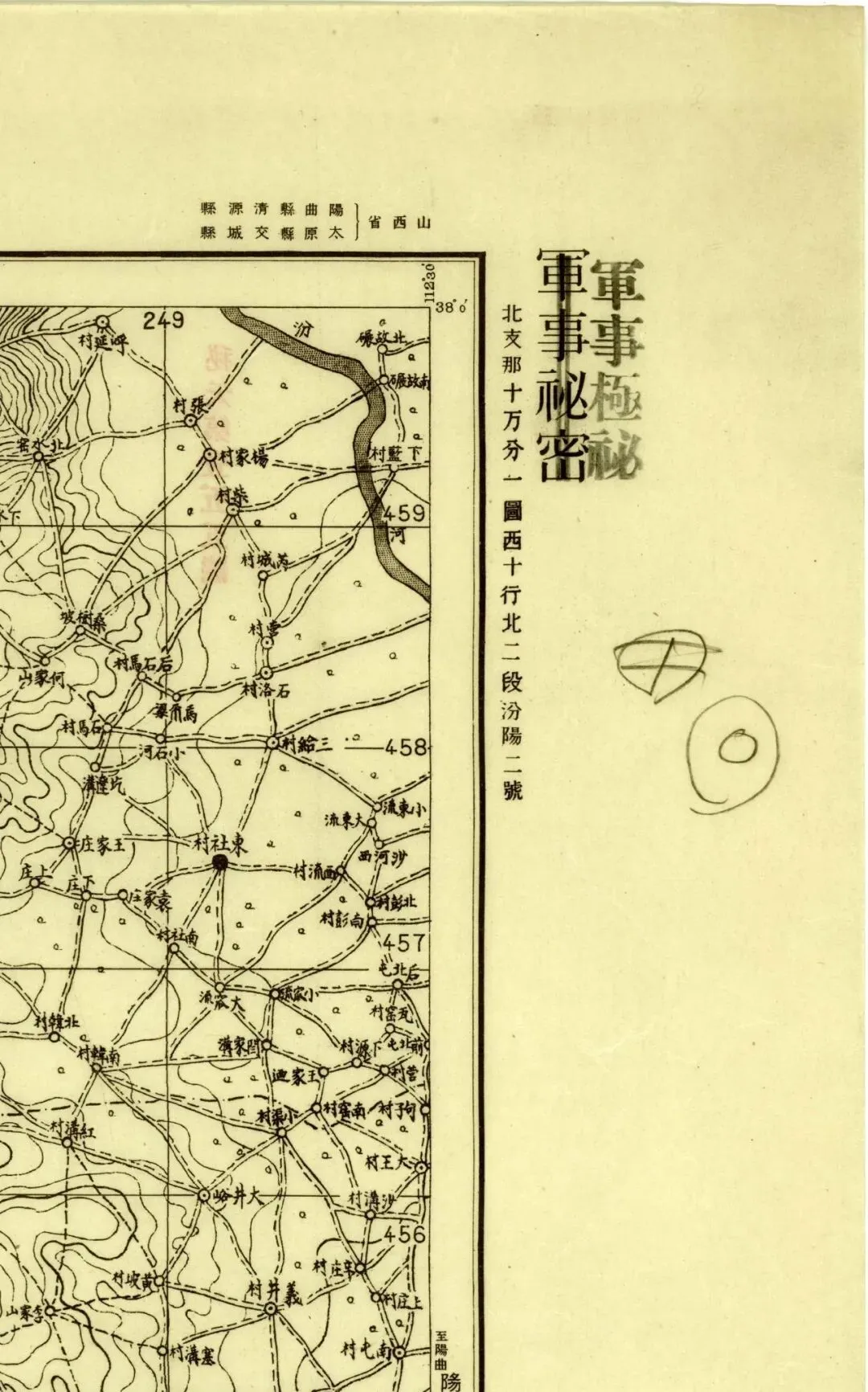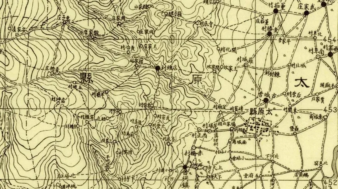 日本人在二十年代的盗测活动曾经涉及到太原县和太谷县,但似乎没有再往西去。所以尽管同为北中国十万分之一图,位置上也挨着,但和东边相邻的《太谷县》和《阳曲县(太原)》并不能拼合。