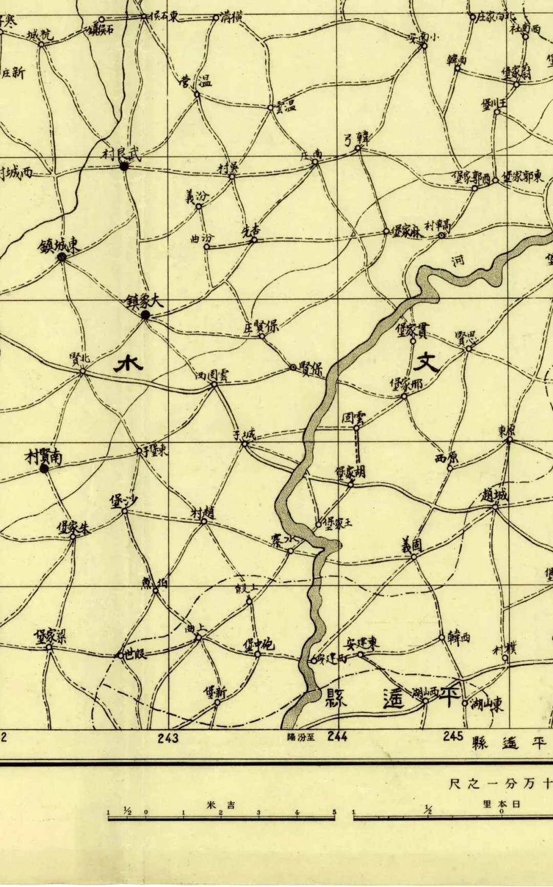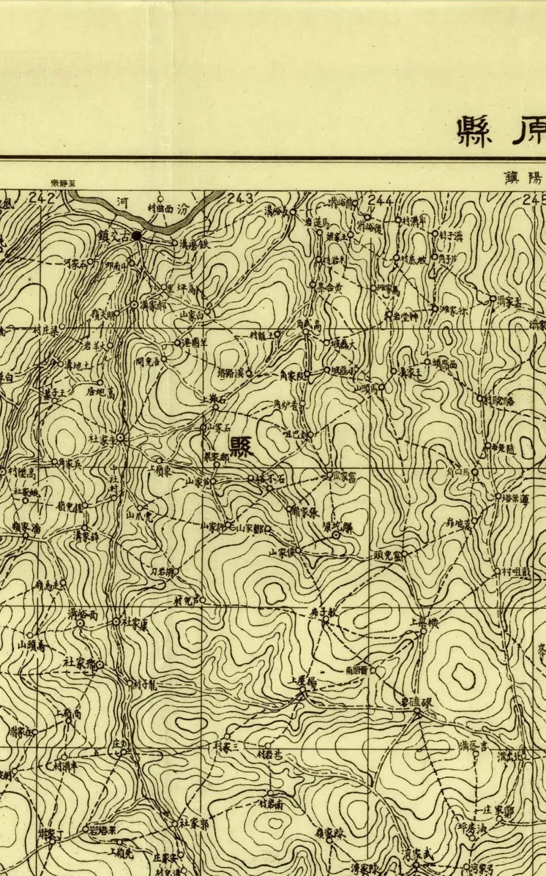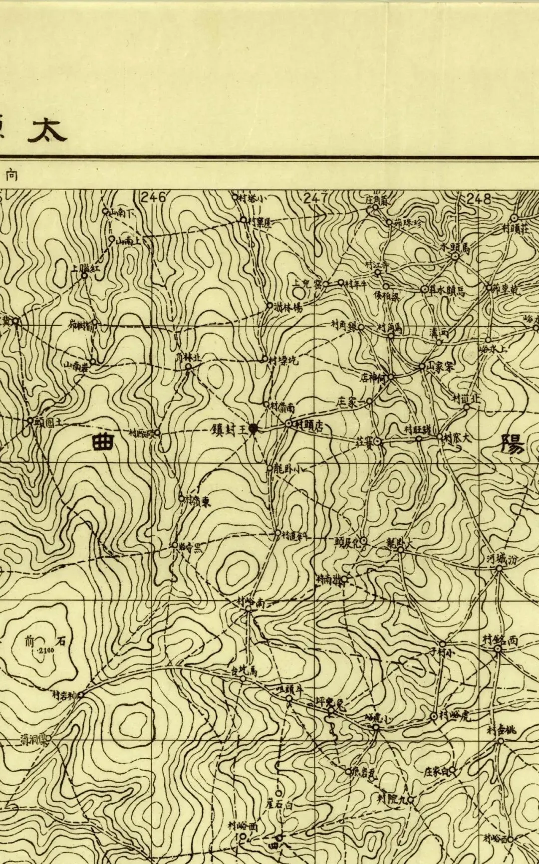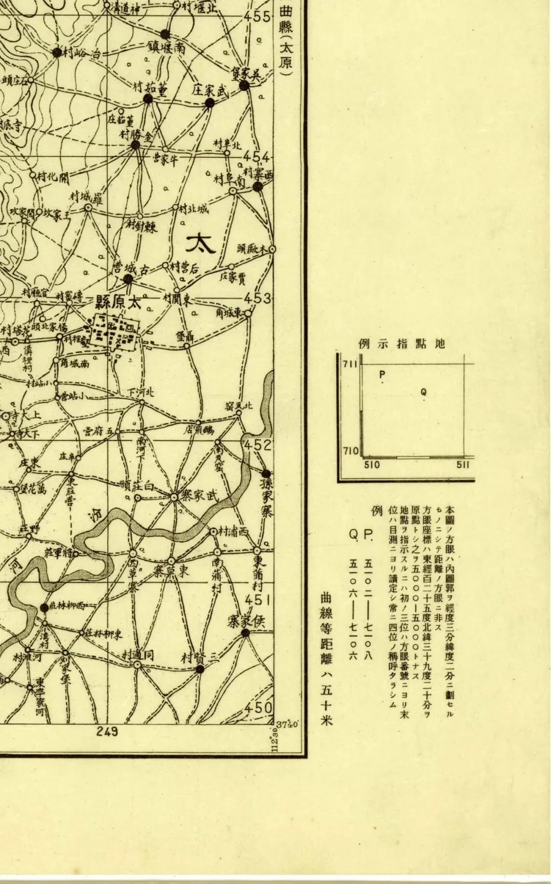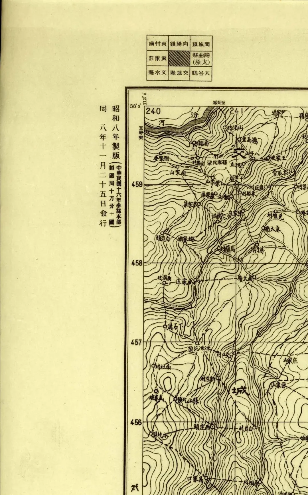 日本人在二十年代的盗测活动曾经涉及到太原县和太谷县,但似乎没有再往西去。所以尽管同为北中国十万分之一图,位置上也挨着,但和东边相邻的《太谷县》和《阳曲县(太原)》并不能拼合。