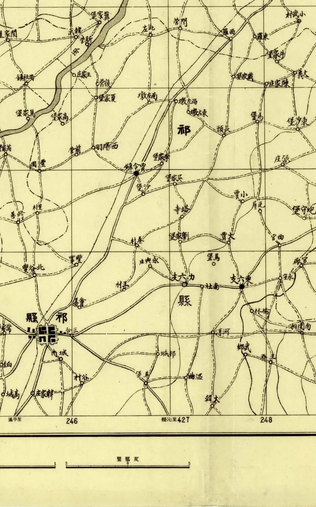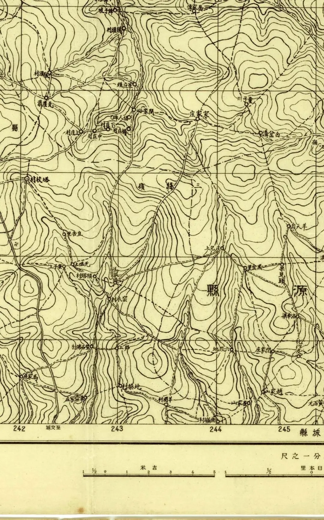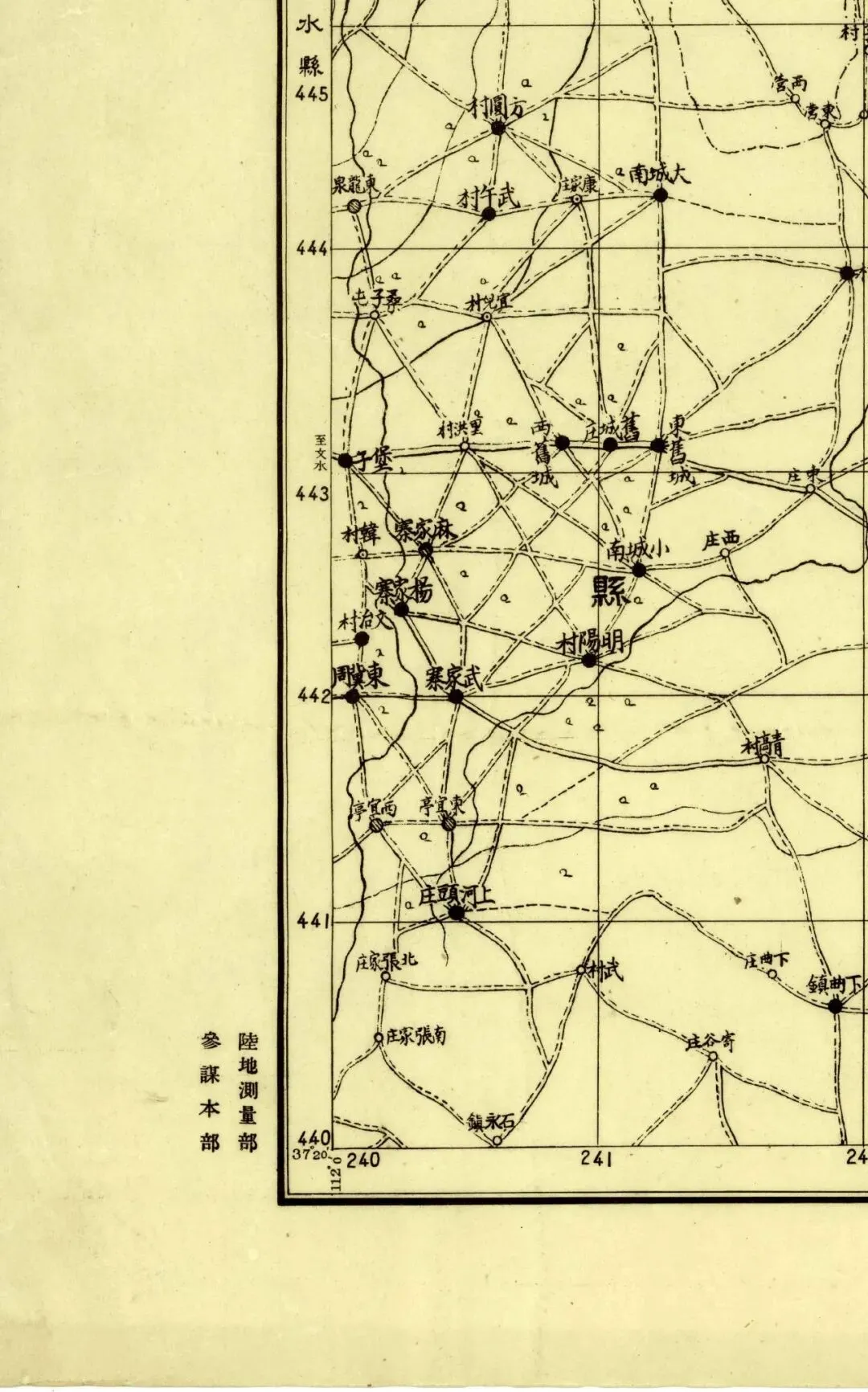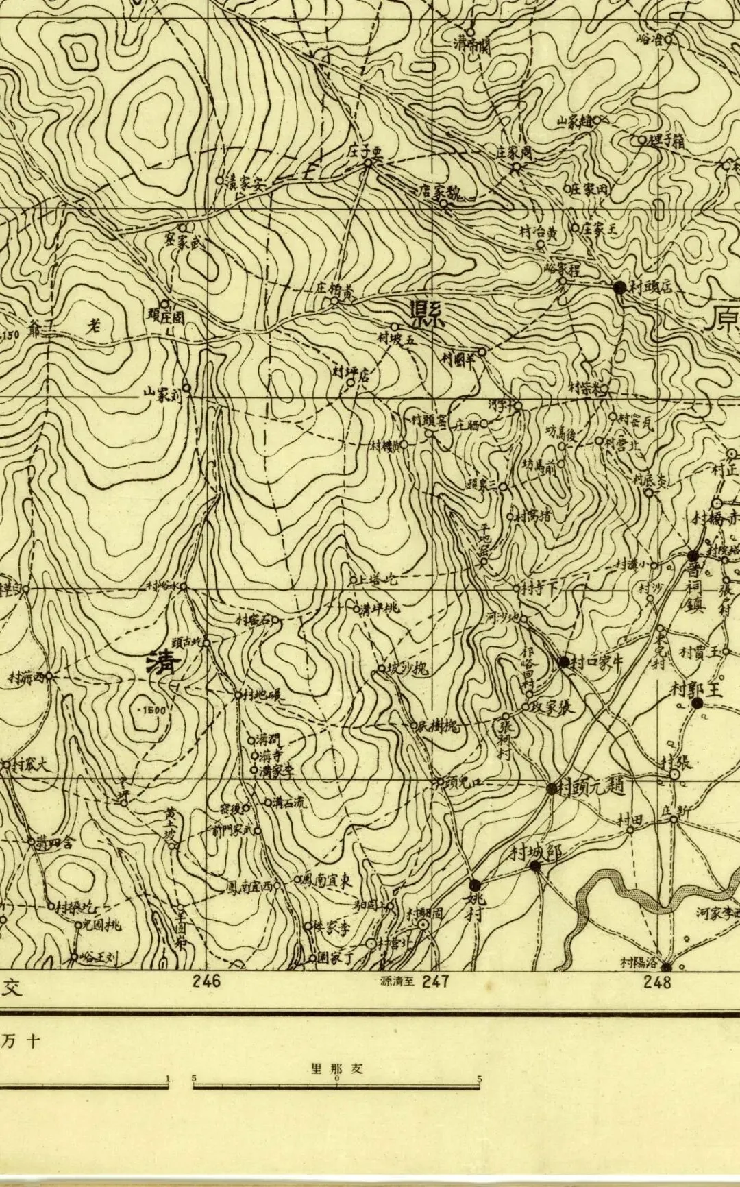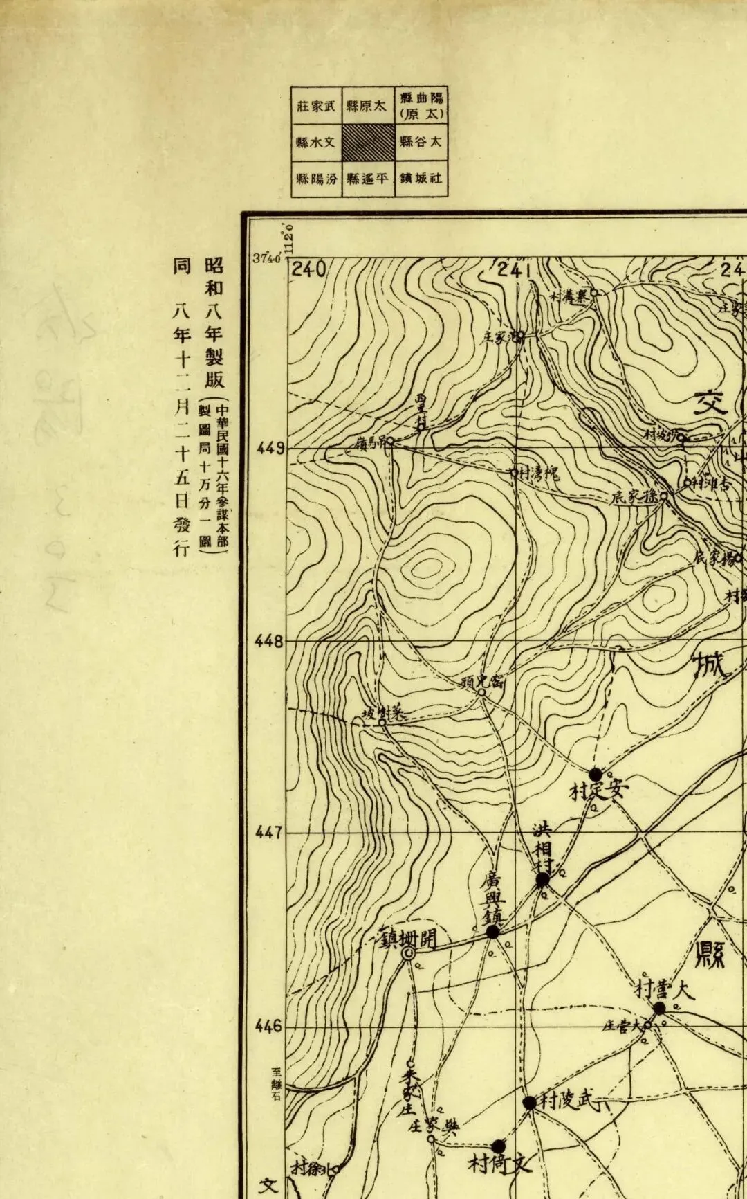 日本人在二十年代的盗测活动曾经涉及到太原县和太谷县,但似乎没有再往西去。所以尽管同为北中国十万分之一图,位置上也挨着,但和东边相邻的《太谷县》和《阳曲县(太原)》并不能拼合。