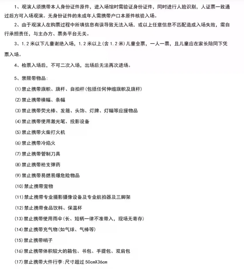 禁止携带物品:由于安保和版权的原因,大多数演出、展览及比赛场所禁止携带食品、饮料、专业摄录设备、打火机等物品,请您注意现场工作人员和广播的提示,予以配合