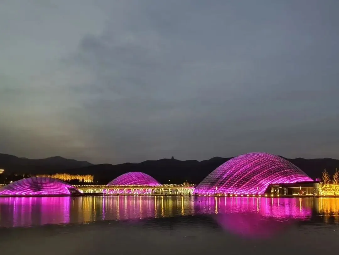 园区里标志性的球形温室穹顶,白日里是晶莹的玻璃建筑,入夜后,便被紫色的灯光点亮。圆润的穹顶被柔和的紫光包裹,像一颗巨大的紫色水晶球,镶嵌在夜色里,光影流转,梦幻又科幻。灯光倒映在一旁的湖面上,水波荡漾,紫影摇曳,与星空交相辉映,仿佛闯入了科幻电影里的外星基地。