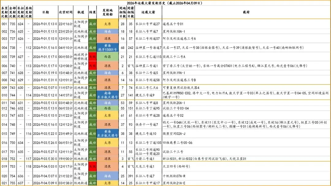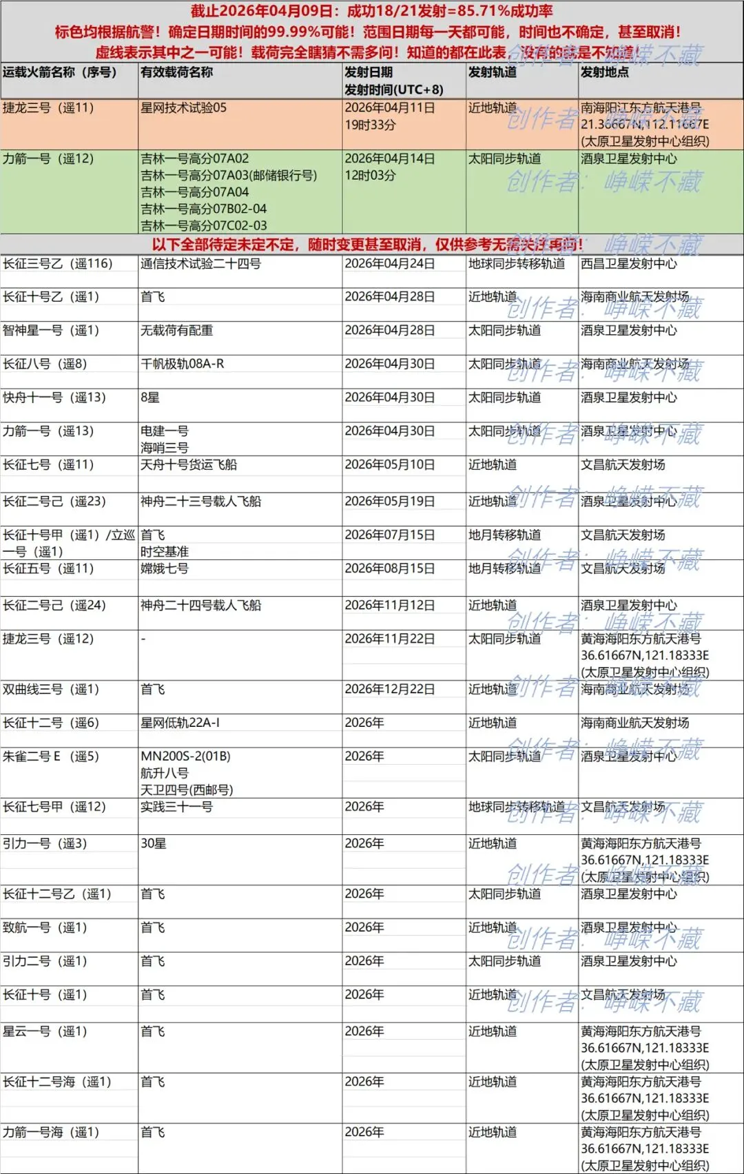 虽然10日国内航景仍在,但同日国外航景取消,而14日国内外航景均在,力箭可能只有1发延期到下周!2026年成功率85.71%=18发成功3发失败!4月2发成功,1发失败,2发确定,6发待定,其余未定不定!时不我待,指日可待!急不可待,拭目以待!