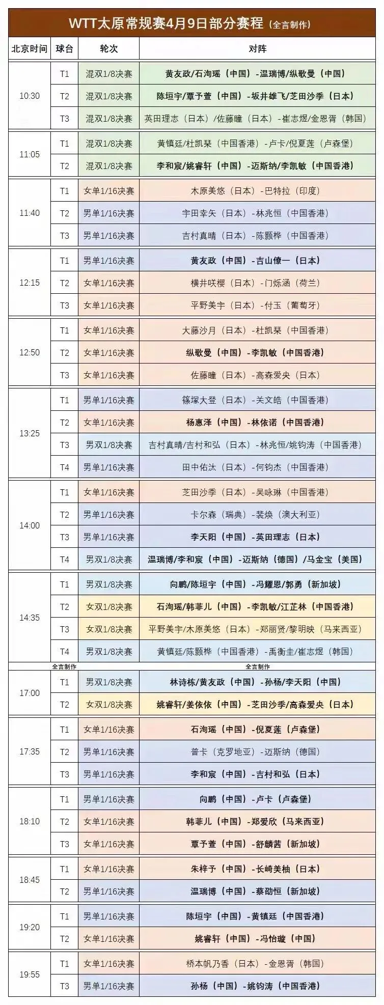 WTT太原常规赛正赛今天开打。