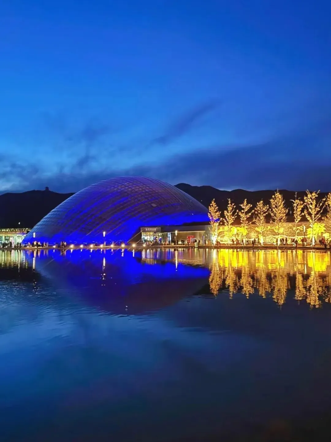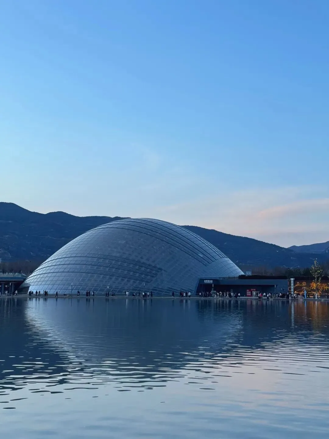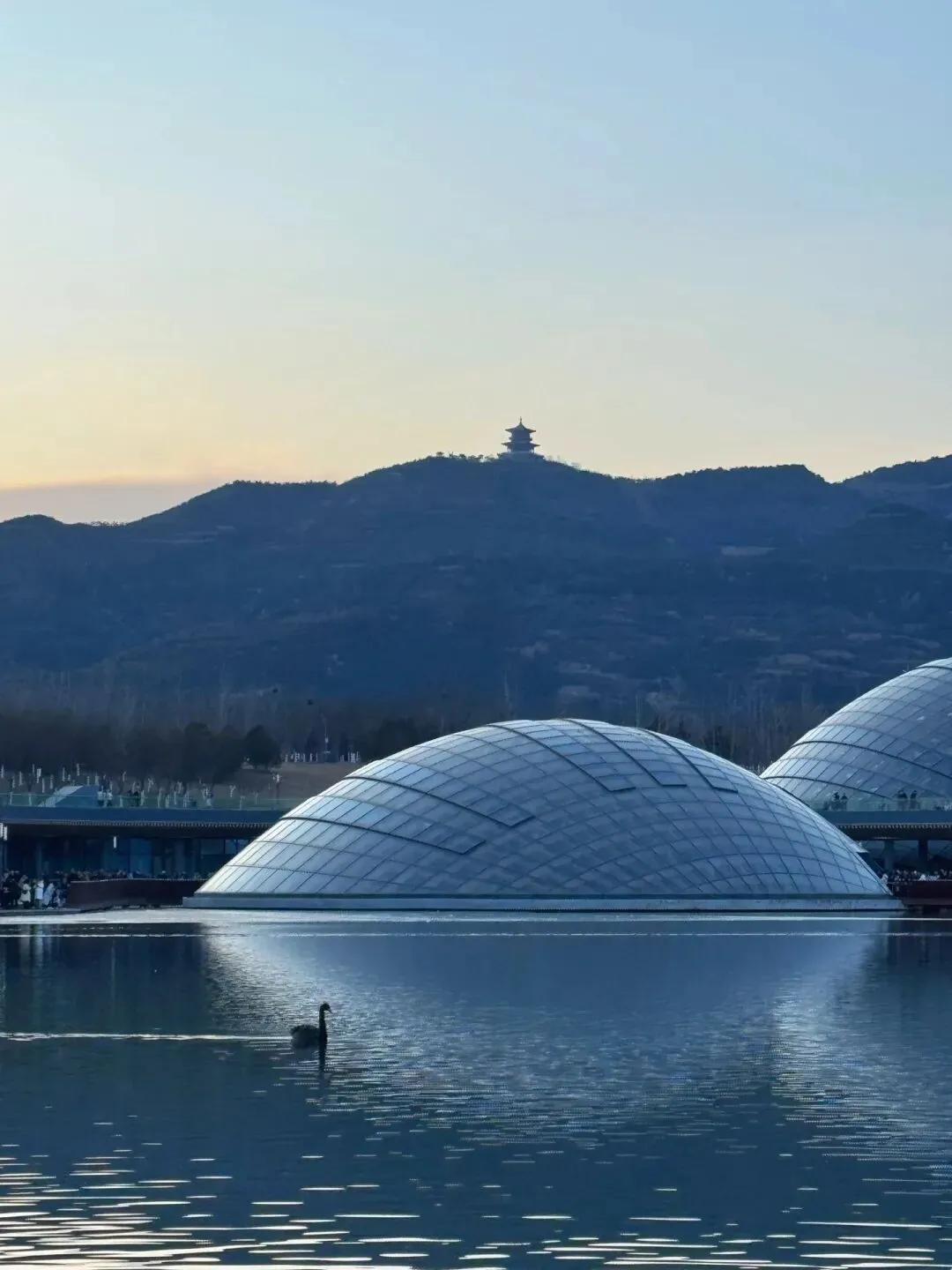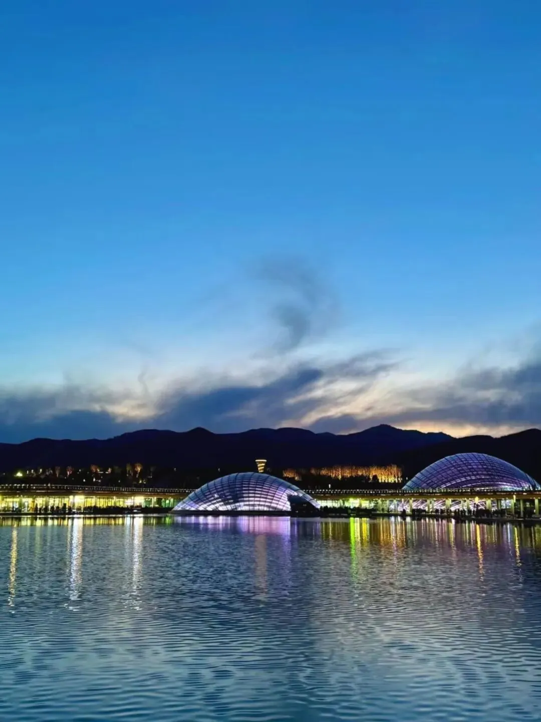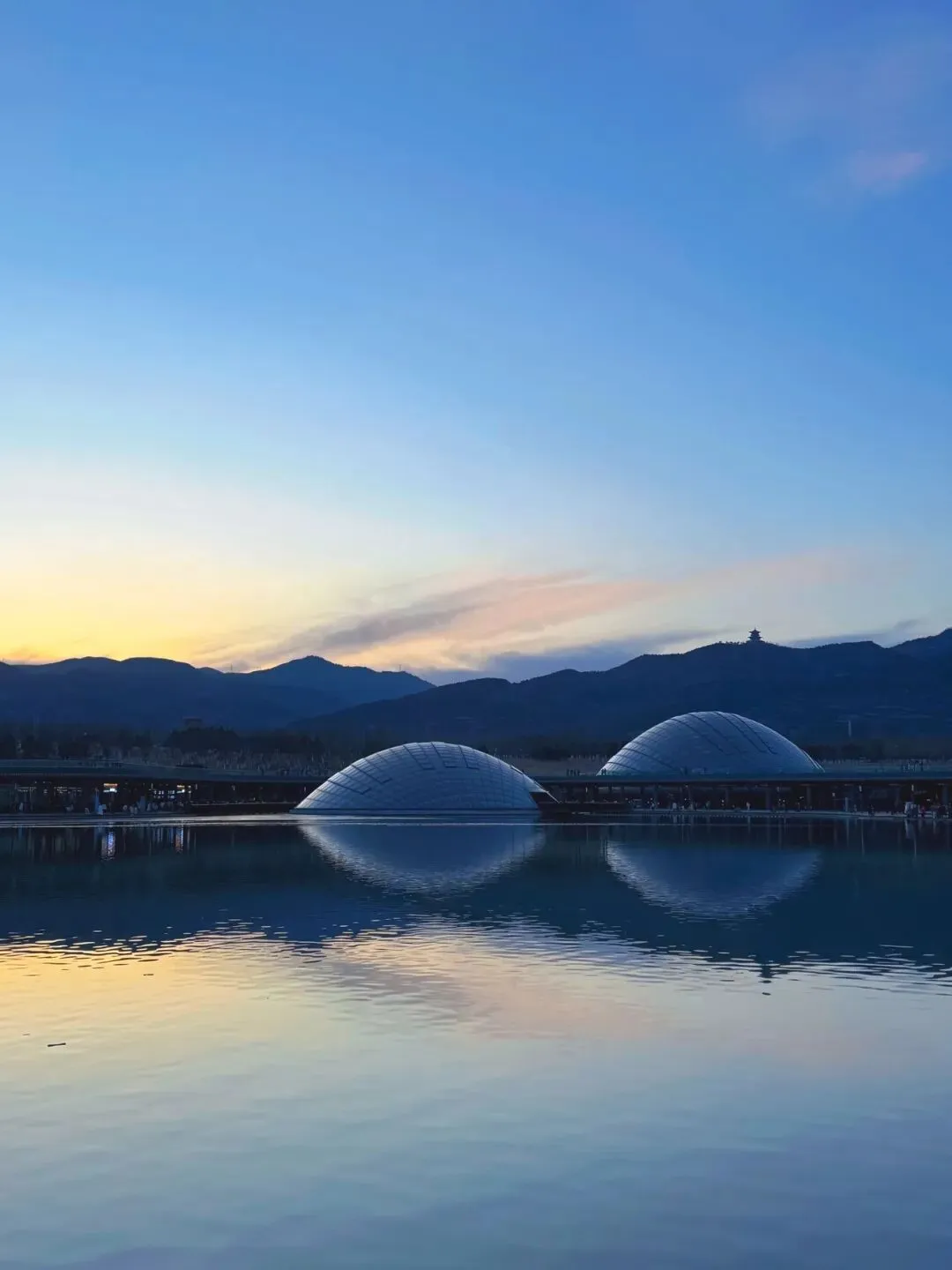 吃了一根烤面筋的功夫,追完了一场完美的日落。三座玻璃穹顶在湖面投下对称的影子,远山衔着落日,把天空染成温柔的渐变蓝。现代建筑与自然山水完美相融,连空气里都满是松弛感,这大概就是旅行最动人的瞬间吧。