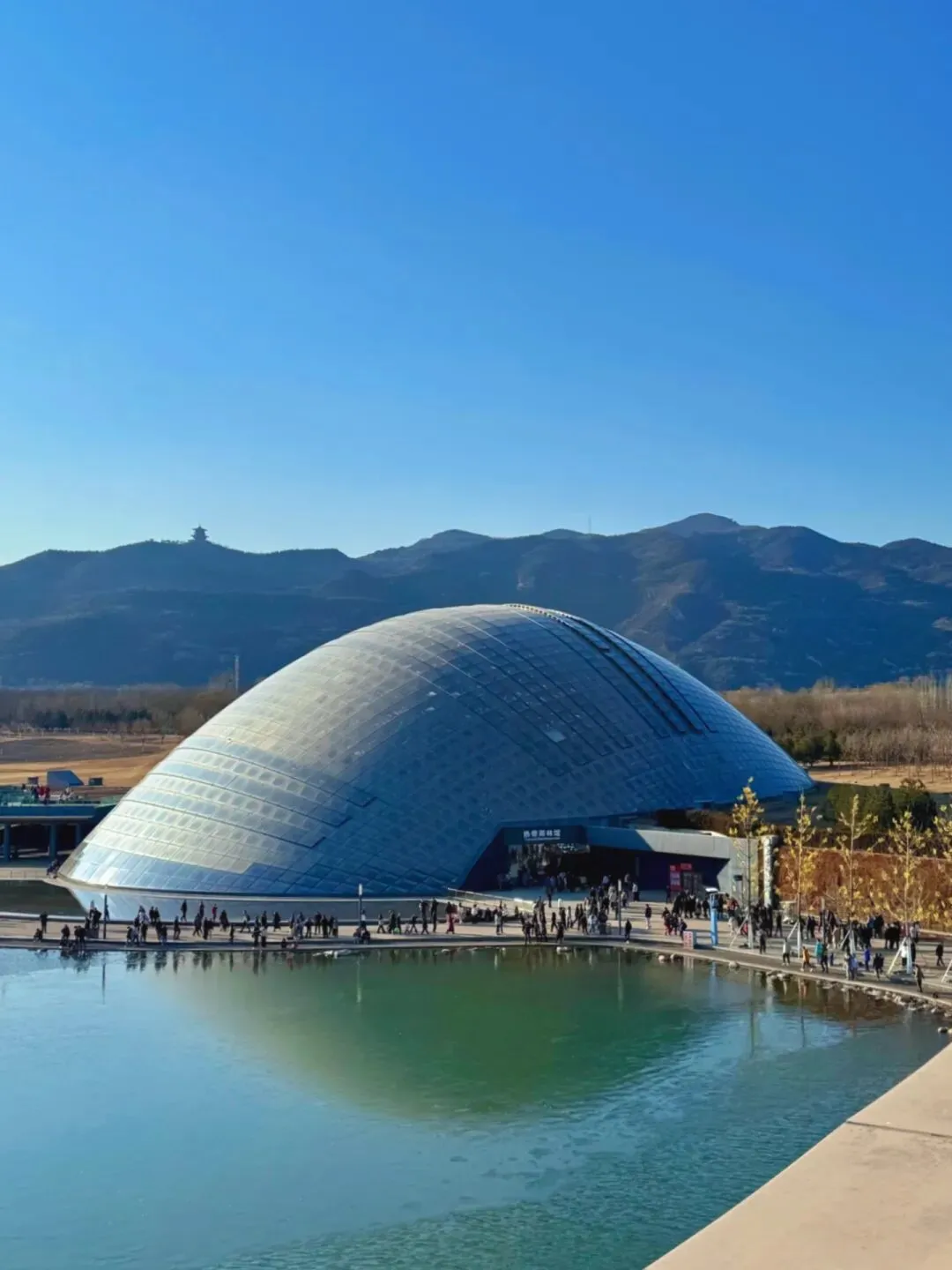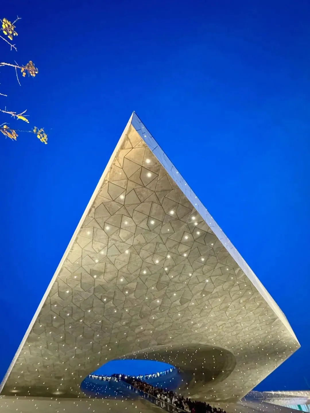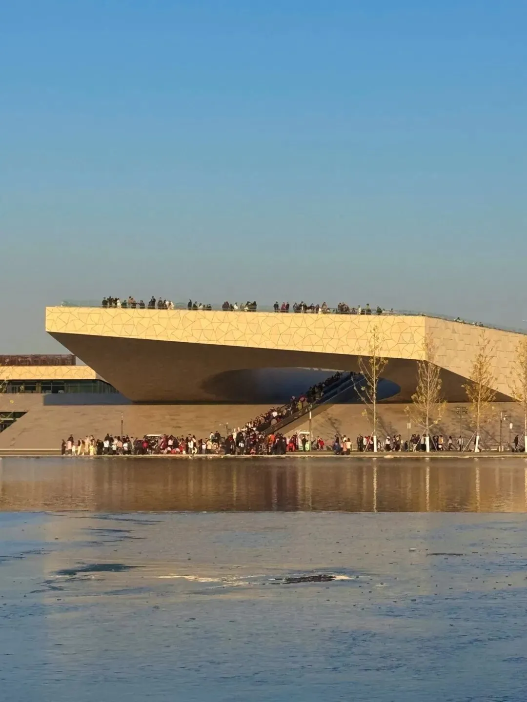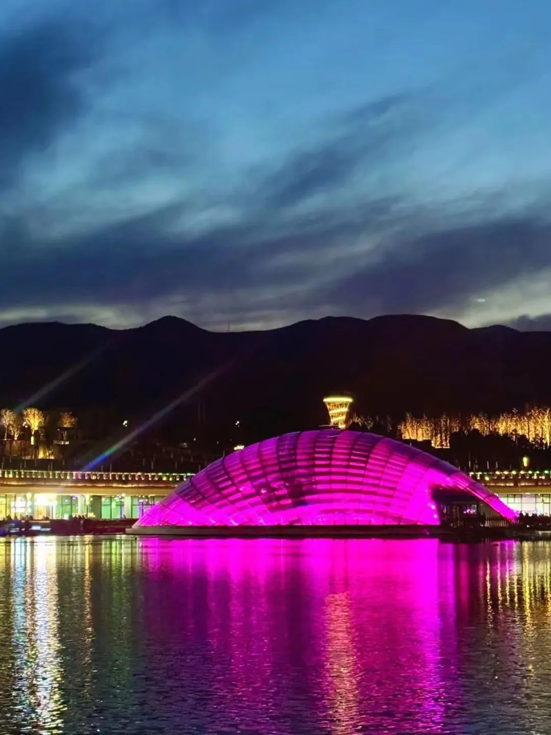 吃了一根烤面筋的功夫,追完了一场完美的日落。三座玻璃穹顶在湖面投下对称的影子,远山衔着落日,把天空染成温柔的渐变蓝。现代建筑与自然山水完美相融,连空气里都满是松弛感,这大概就是旅行最动人的瞬间吧。