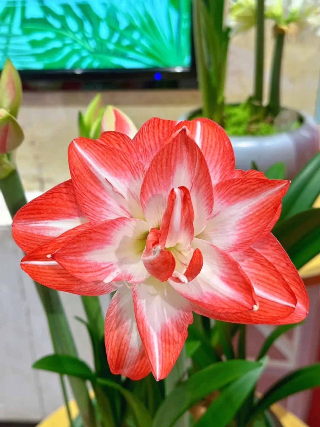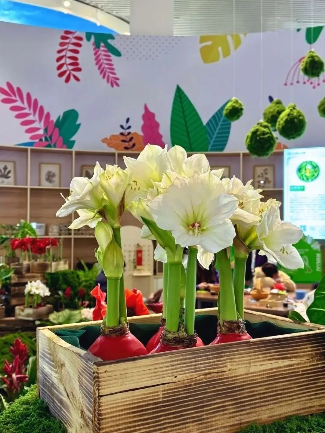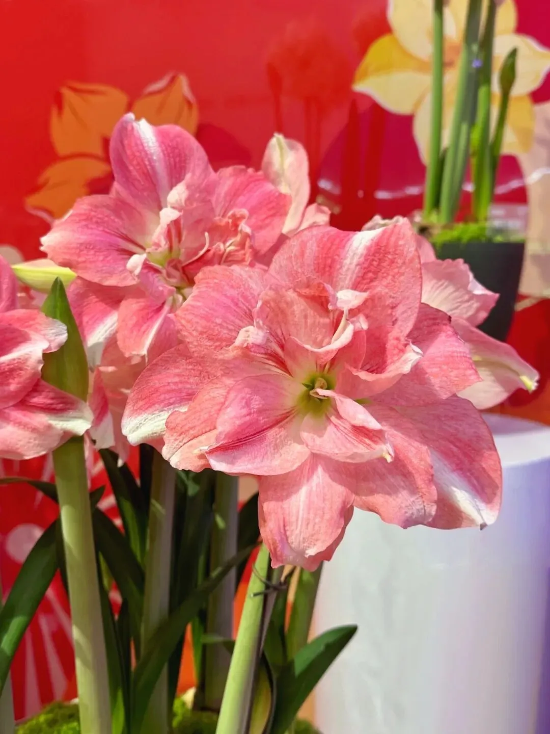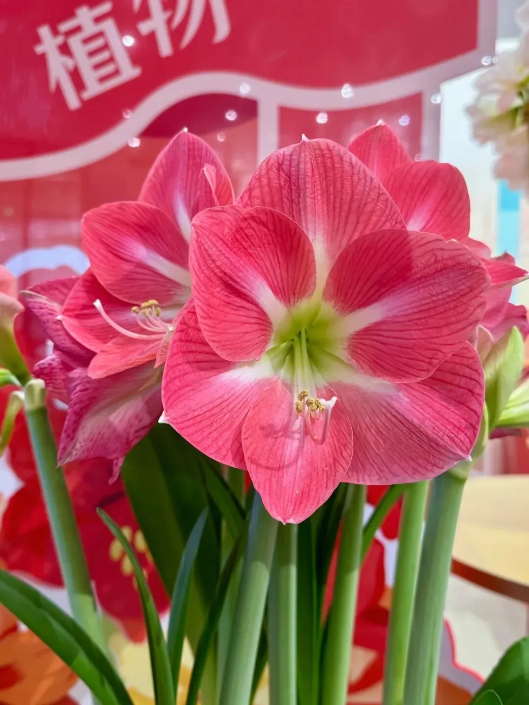各色的花在争奇斗艳,一开始还以为展出的是百合呢!看了它们的身份证才得知,这些花原来叫朱顶红,和百合完全是两种植物!多瓣款粉白渐变的花瓣层层叠叠,像蓬松的衣裙,单瓣款玫红花瓣纹理清晰,白绿相间的花心精致灵动。