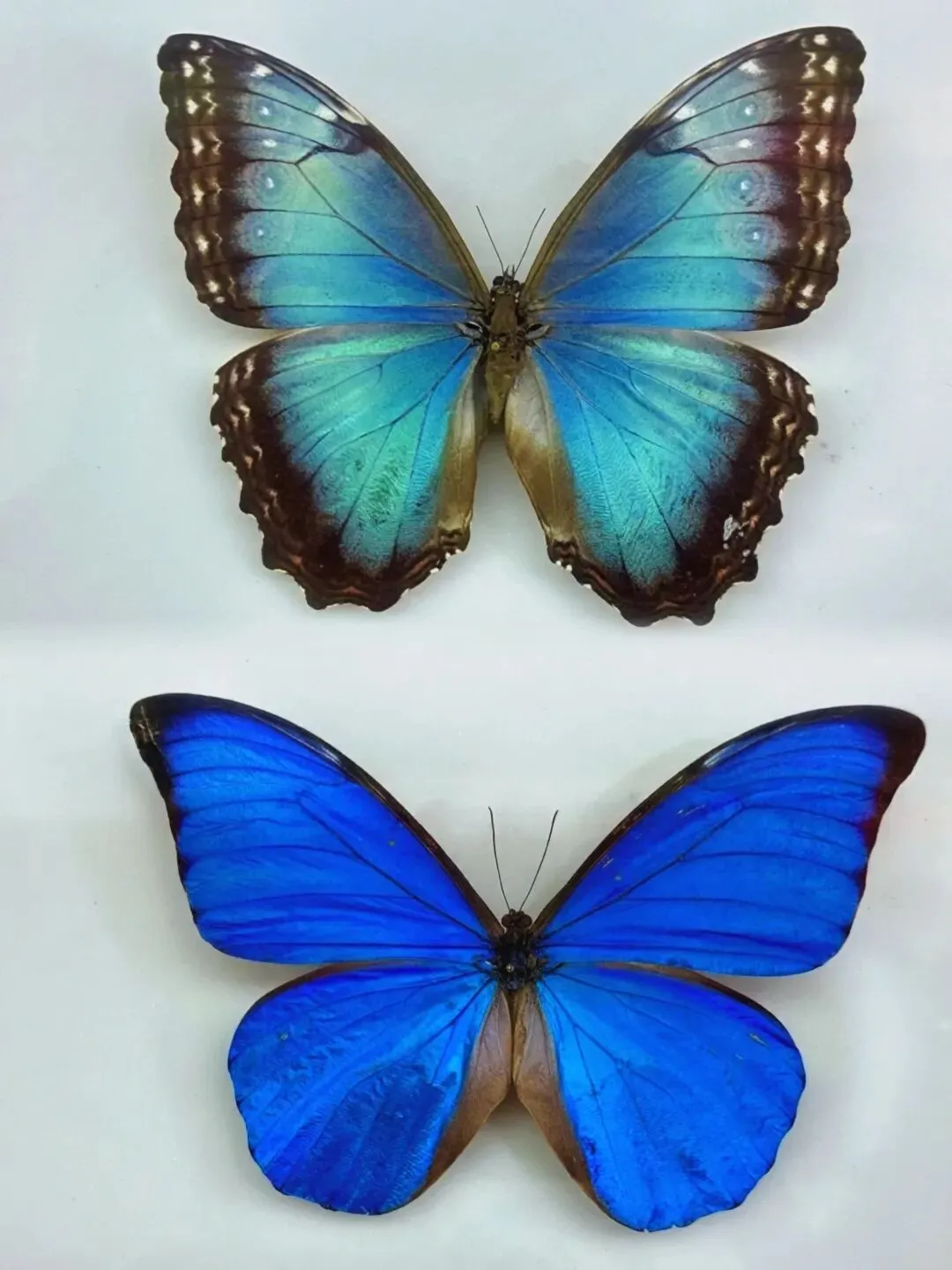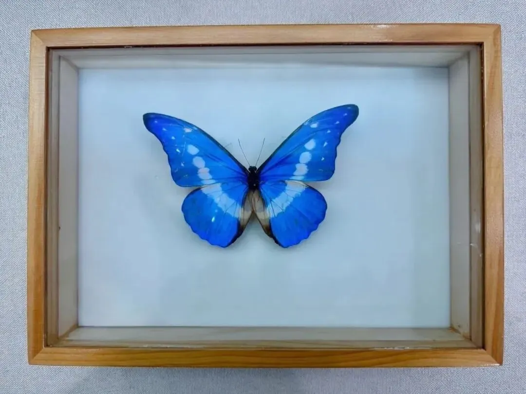 玻璃展柜里,甲虫与蝴蝶的标本静静陈列,每一件都是大自然的艺术杰作。昆虫身披金属光泽的战甲,像一件精心雕琢的宝石工艺品。而最惊艳的莫过于几只闪蝶,翅膀上的鳞片在光线下折射出蓝色梦幻光泽。