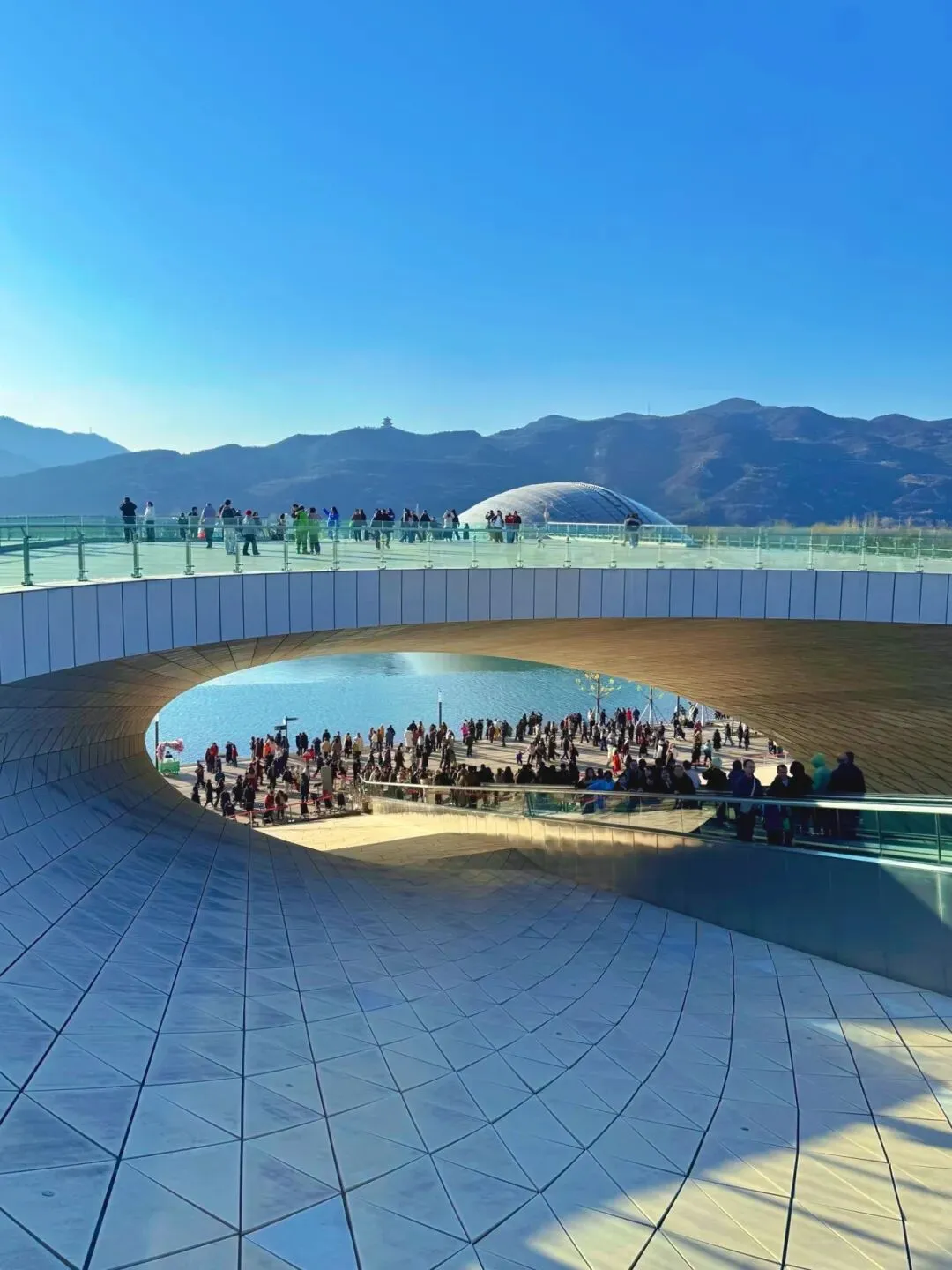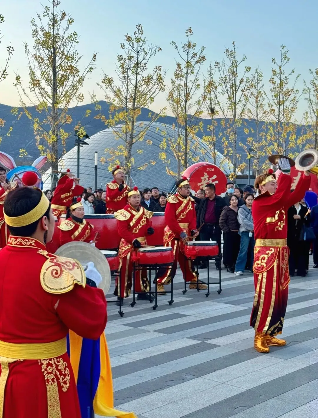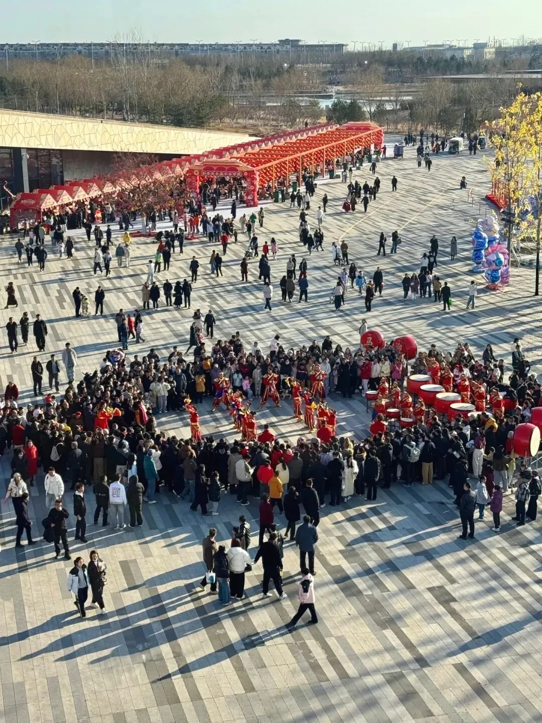广场上人头攒动、摩肩接踵,过年就是显得热闹。表演的队伍被里三层外三层的游客围得水泄不通,震天的鼓声里满是烟火气;就连环形观景桥上下,也挤满了打卡的游人,蓝天、远山与攒动的人影相映,处处都是人潮涌动的热闹景象,足见这里的人气有多旺。