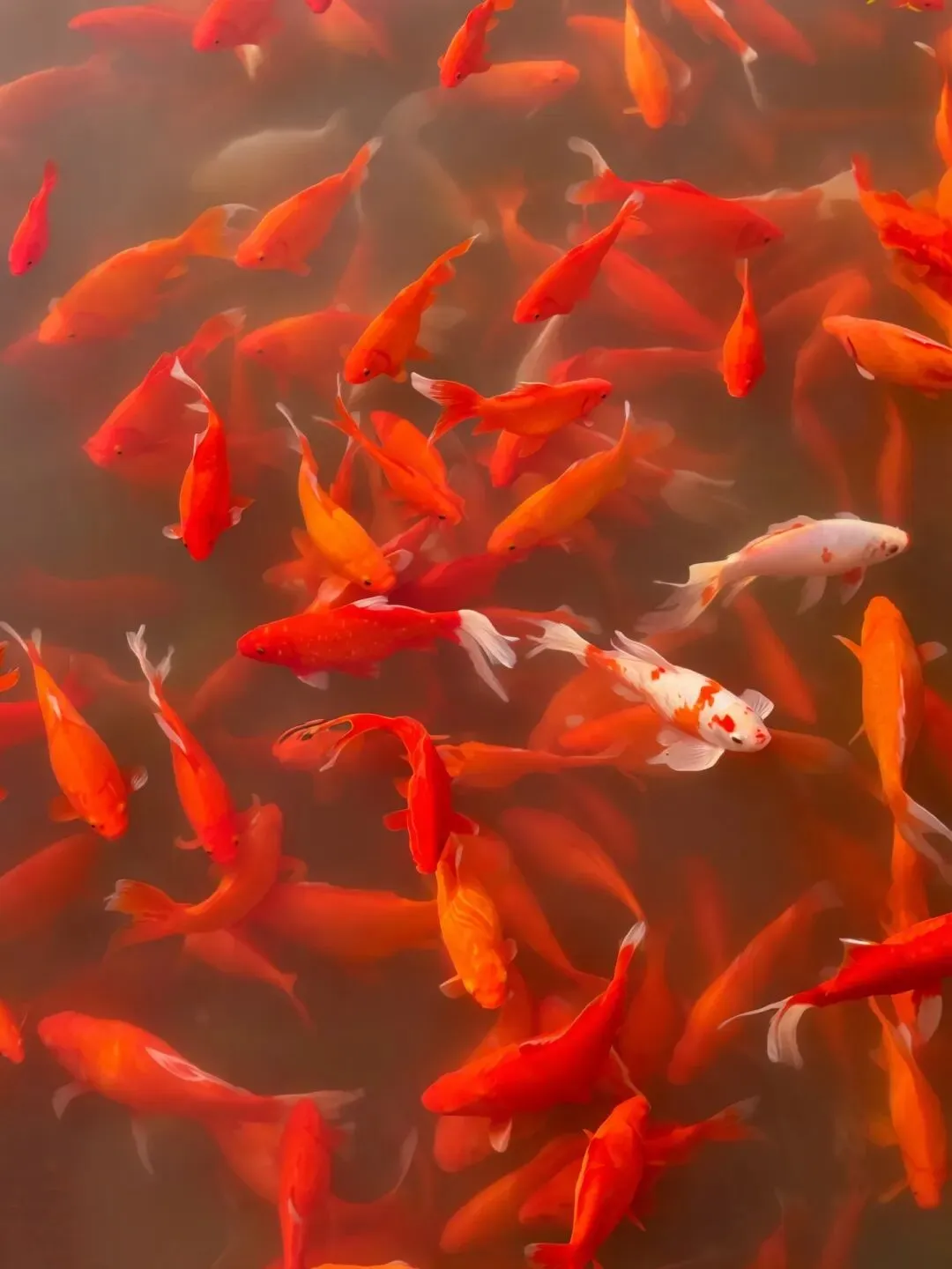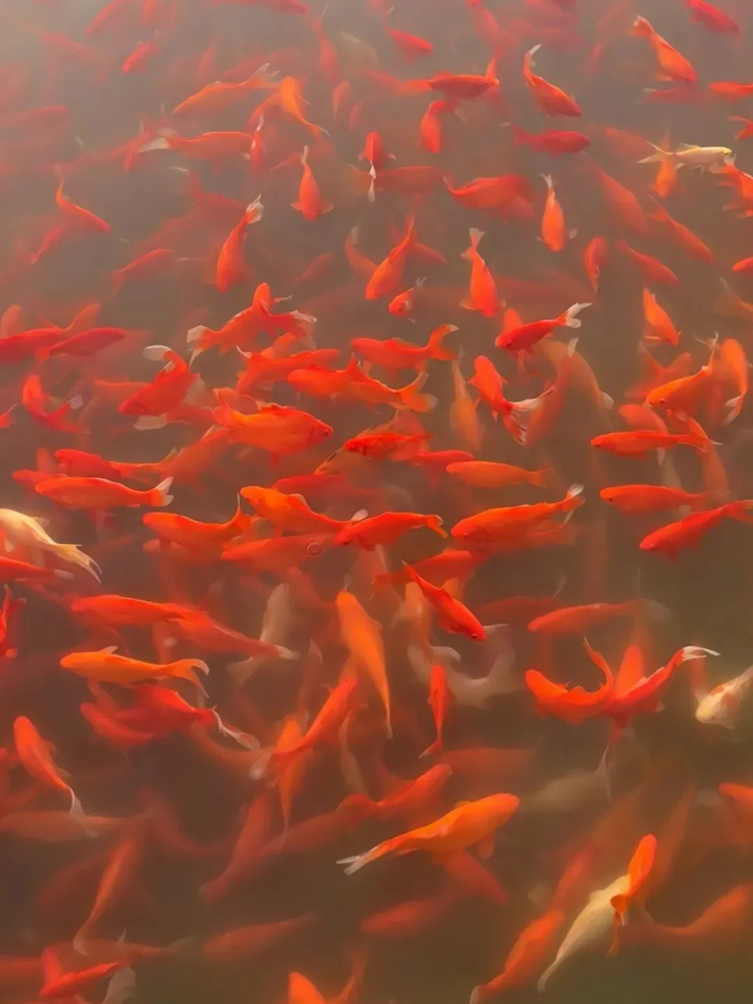站在池边看了好久,满池的锦鲤在水里自在穿梭,密密麻麻的在水里翻涌,像一整片流动的火焰,满眼都是鲜活的旺气。