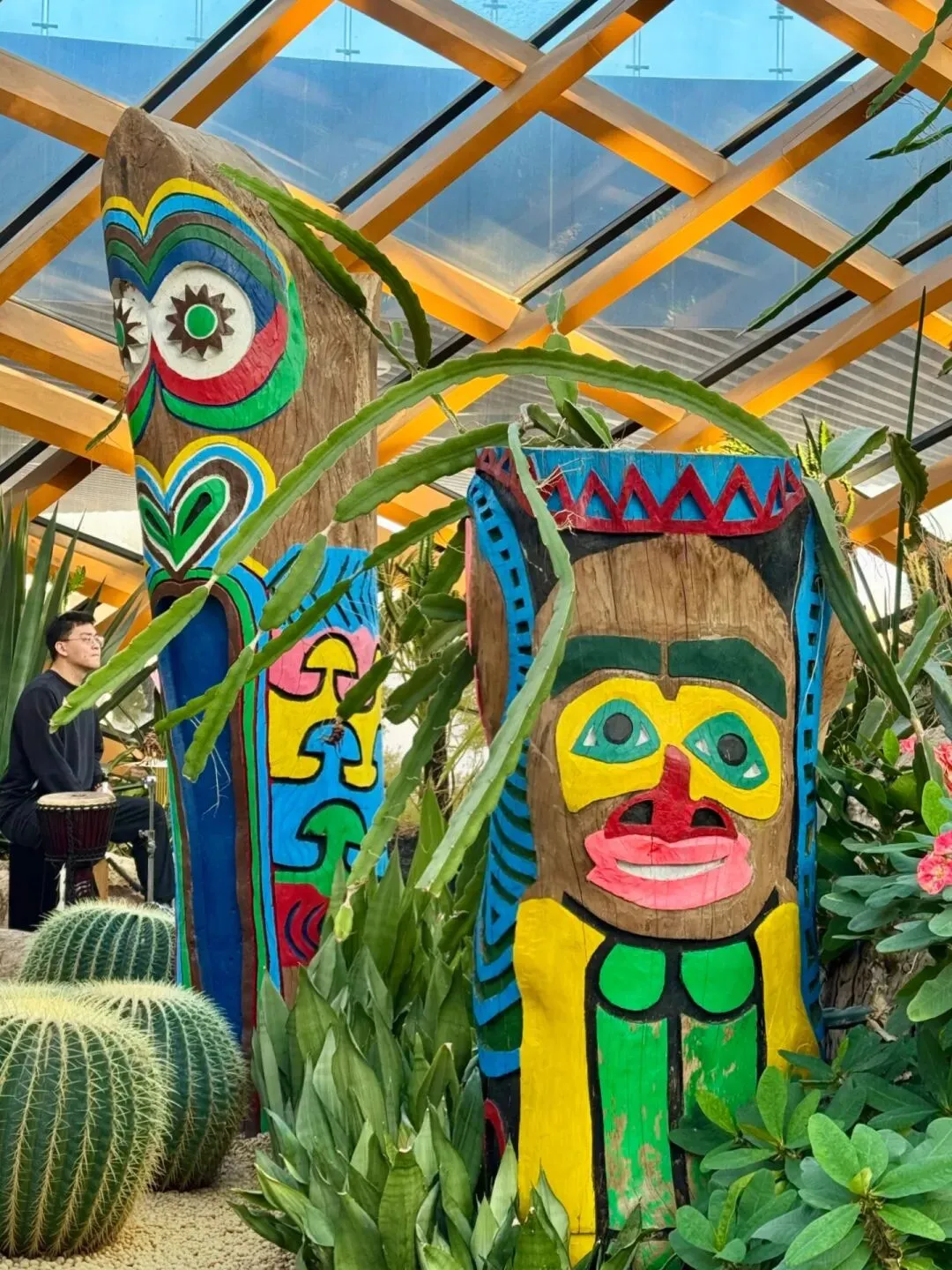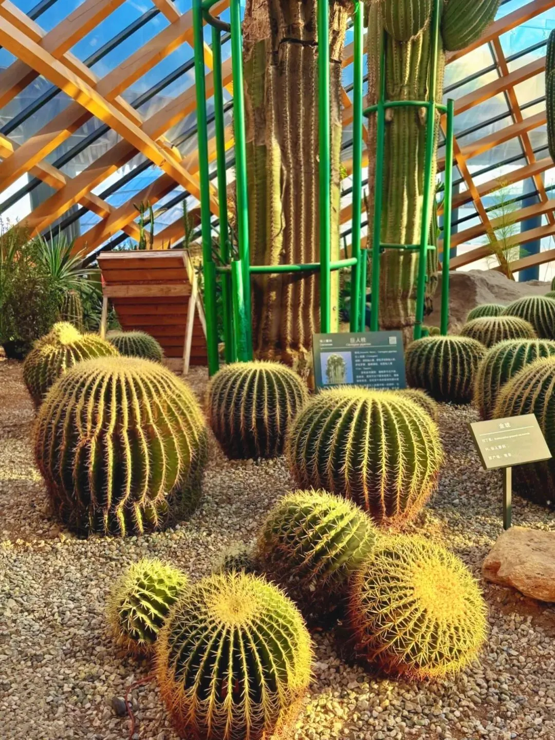 植物温室里的展区,这边是圆滚滚、金灿灿,霸气侧漏的金琥军团,那边角落里却藏着各种叫不上名字的雨林小花。一边是刚硬的沙漠硬汉,一边是软糯的热带雨林精灵,这种反差感也绝了。