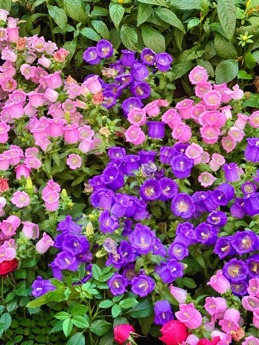第一次亲眼见到风铃草,才发现它比我想象中更娇弱。薄透的花瓣像被风揉过的糖纸,粉紫相间地垂成一串小铃铛,连阳光都能轻轻透过去。
