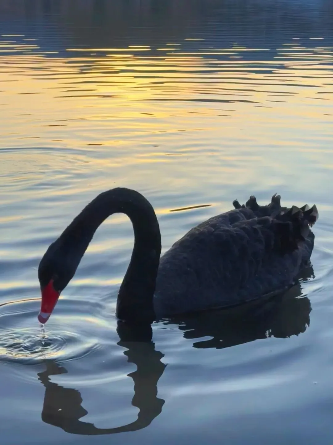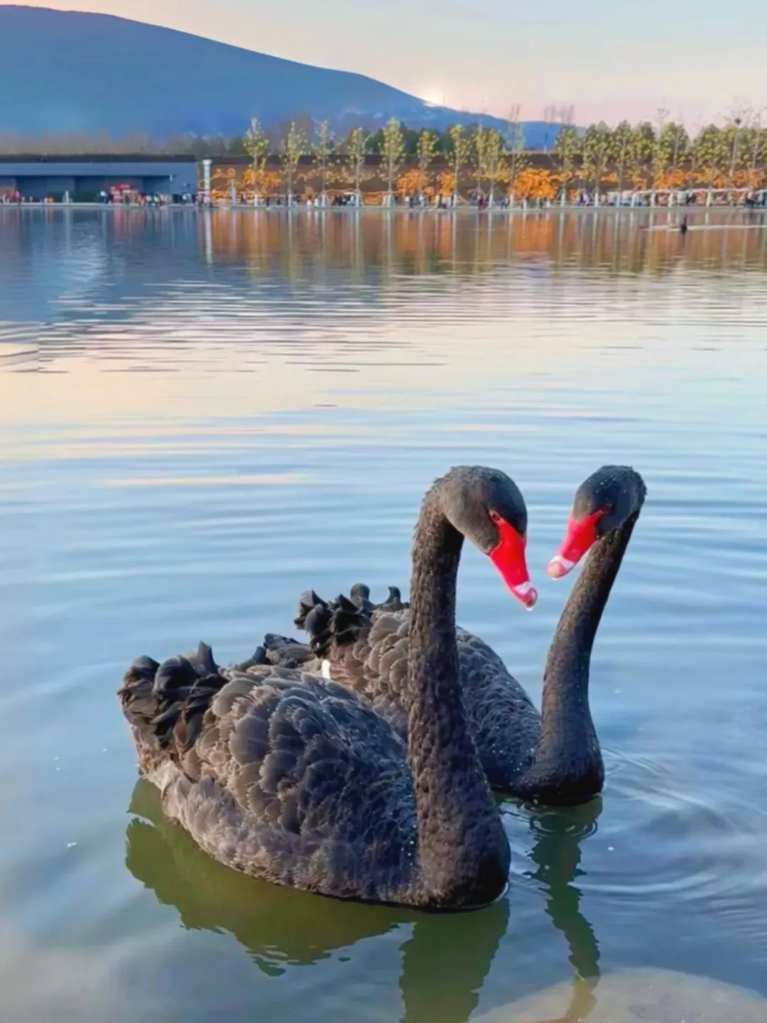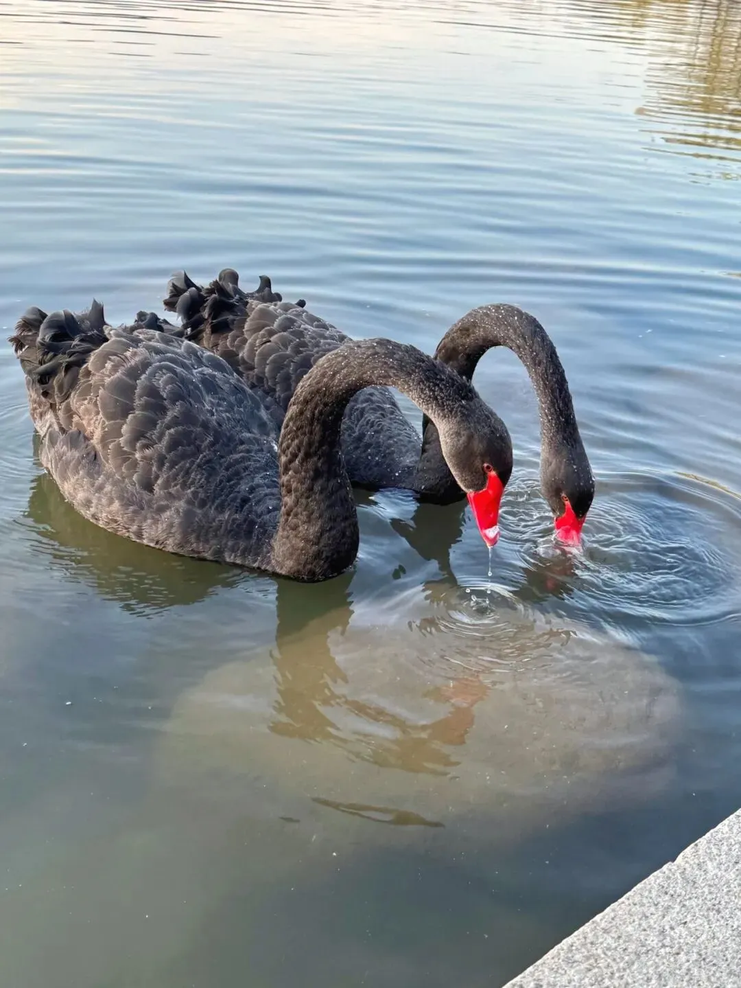 谁能拒绝湖面上的黑天鹅呀,墨黑的羽毛蓬松又顺滑,红通通的喙可爱又醒目。它们一会儿凑在一起贴贴,一会儿同步低头喝水,连溅起的水花都透着甜甜的氛围感,简直是把恩爱都写在了水面上。