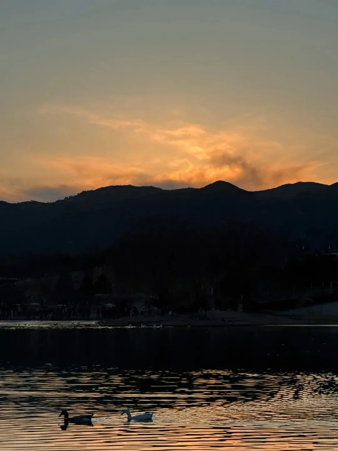 暮色漫过湖面,金橙色的霞光漫过云层,将远山的轮廓晕染成温柔的剪影,湖面映着落日的余温。
