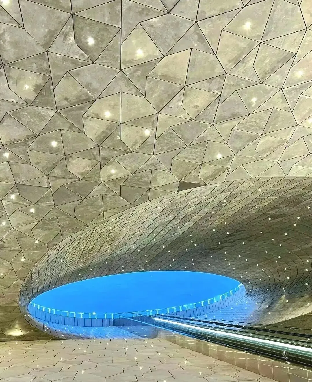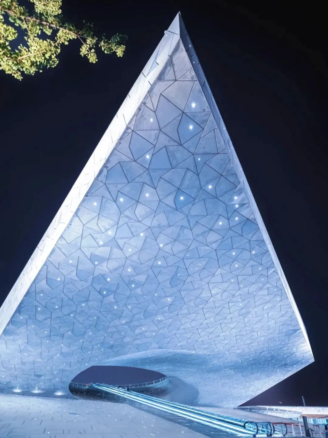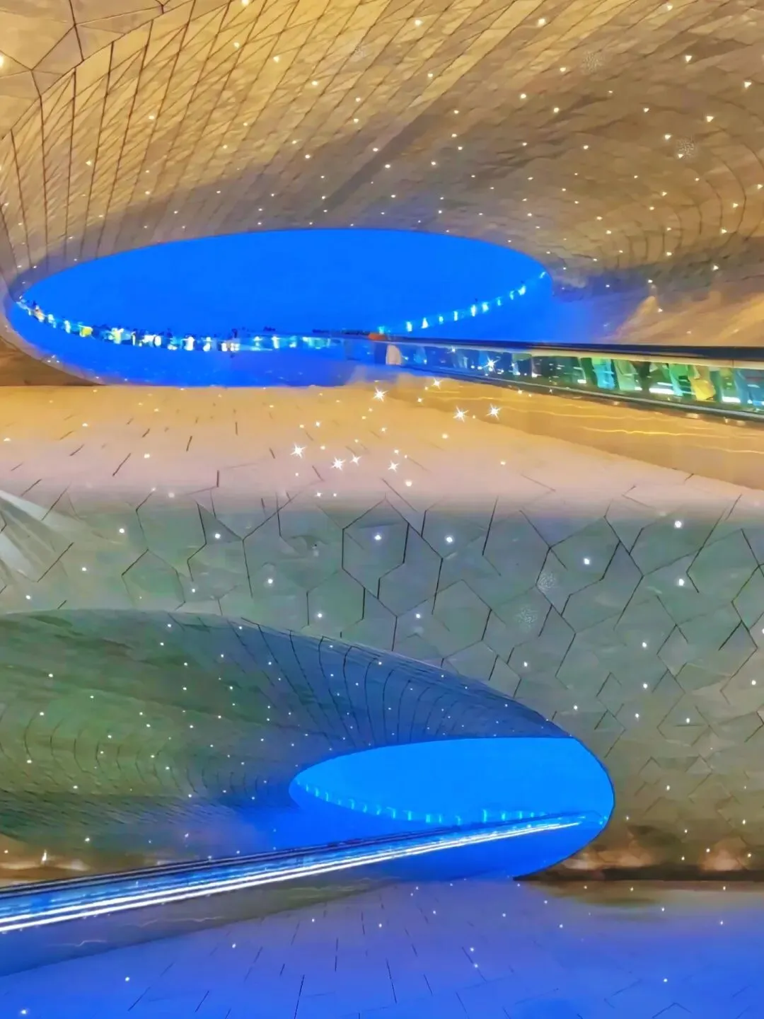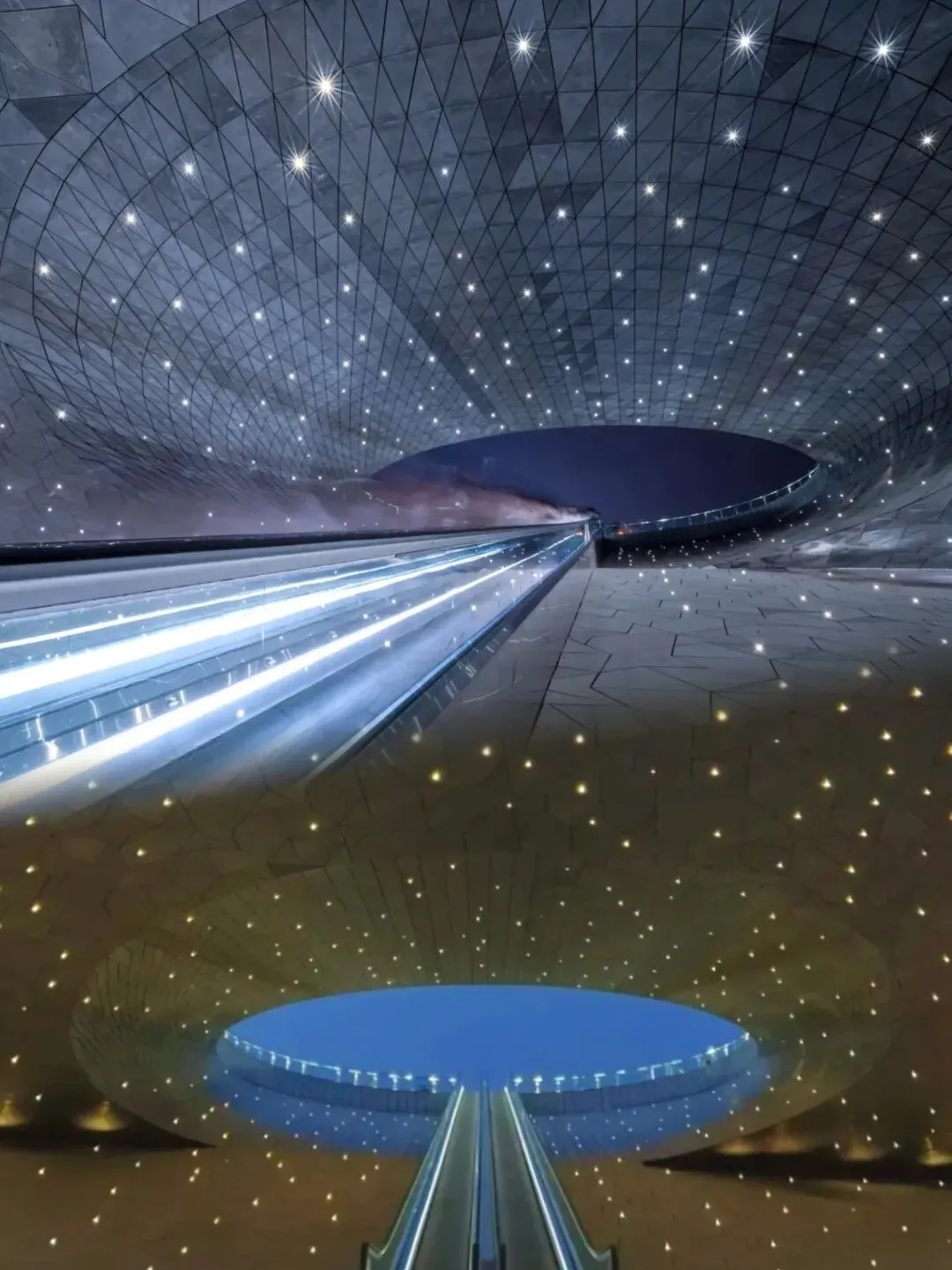 城市的喧嚣退去,只留这片静谧的蓝。建筑的线条如刀锋般锐利,却在灯光的渲染下变得温柔。一边是头顶神秘的空间站,一边是脚下延伸的星光隧道。