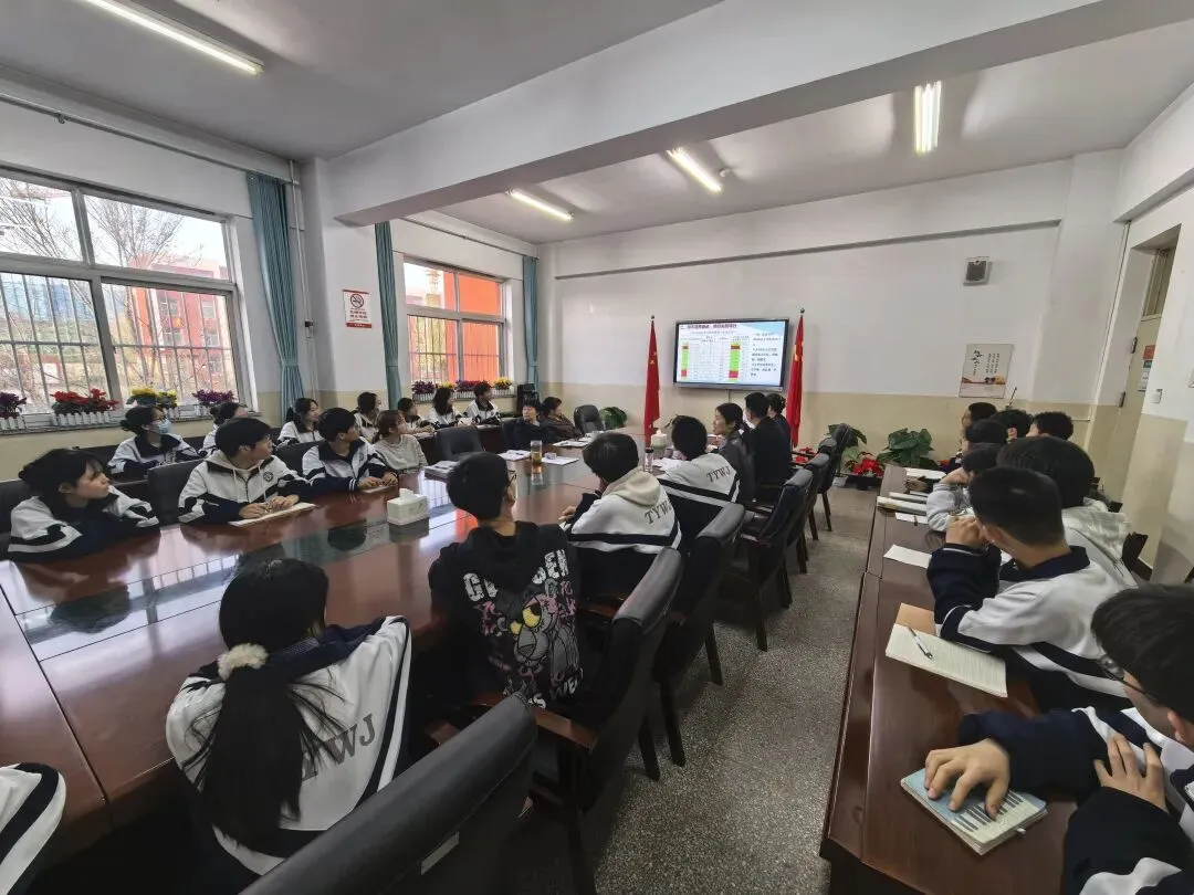 教学副校长阎君为参会的学生加油打气。阎校长首先肯定了高三全体学生的备考状态,随着时间越来越短,脚步越来越紧,高三年级的学生要做到“快中求稳、行稳致远”。同学们要做好精细规划、提升学习实效,在短时间内提质增效,激发自身学习潜能。阎校长认真倾听了同学们对学校常规教学、班级管理、培优课等方面的意见和建议。这种面对面的交流方式,不仅让学生感受到了学校的关怀与重视,更为学校进一步优化备考服务提供了有力支撑。