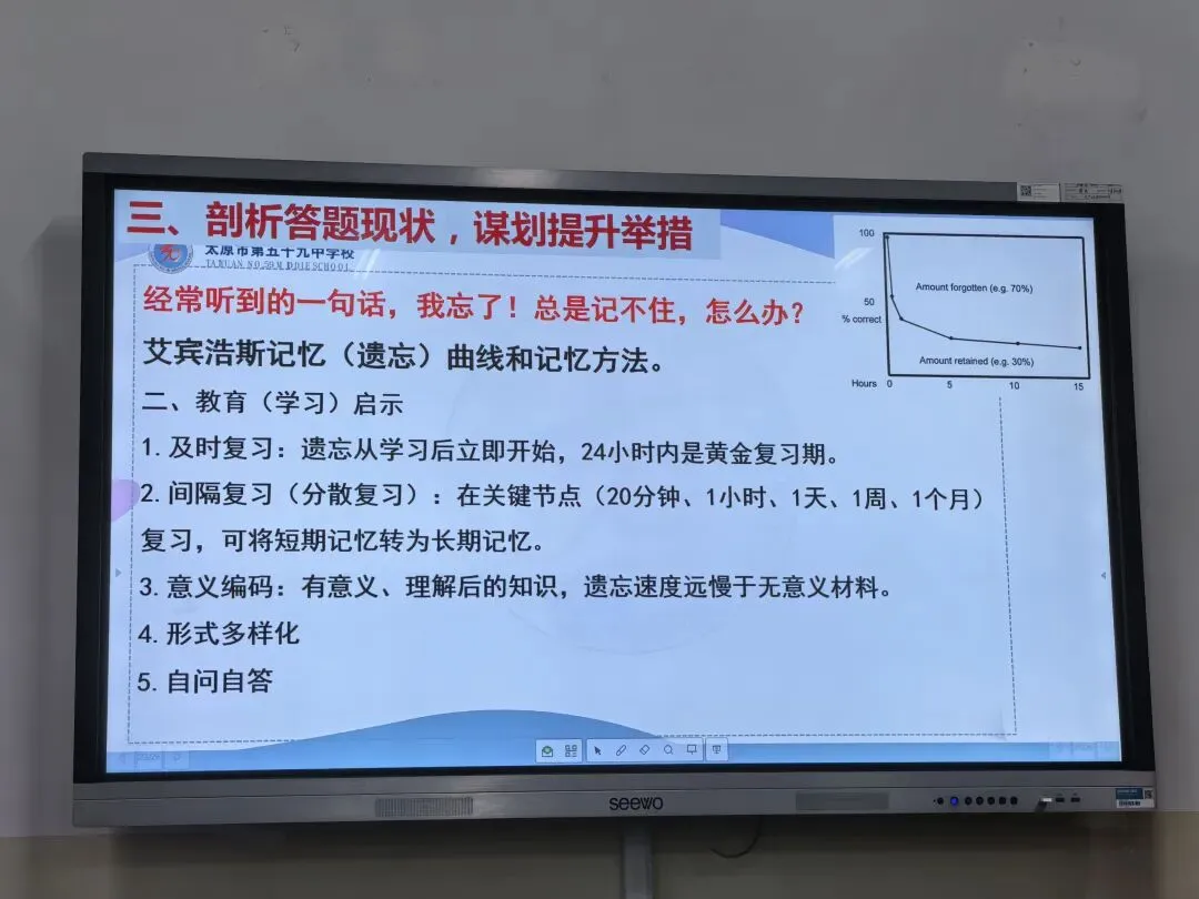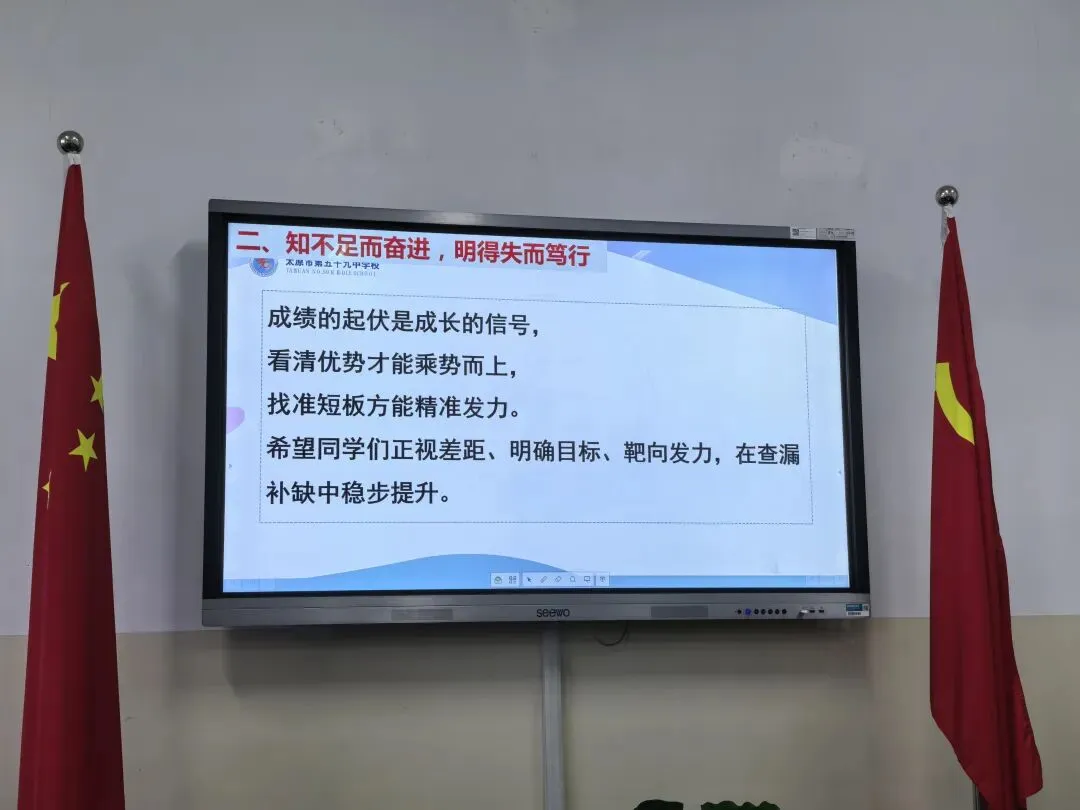会上,首先由教务处副主任赵瑾杰根据“太原市学生发展动态感知系统”反馈的市一模考试成绩数据,精准分析班级学情和学科间的差异,对学生存在的实际问题进行交流。赵瑾杰主任的汇报以“星光不负赶路人,平凡亦能铸辉煌”、“知不足而奋进,明得失而笃行”、“剖析答题现状,谋划提升举措”三个环节展开,从不同学科最高分,平均分,及格率等不同角度对本次考试的总体成绩进行综合评价,寻找出存在问题并给出解决方案。