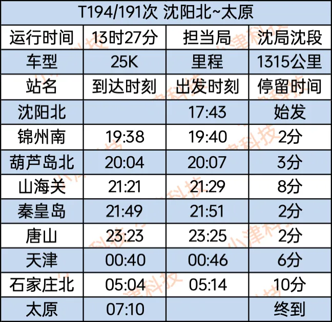 沈阳北站至太原站T194/191次运行13小时27分,沈阳北站17:43始发,经停锦州南站、葫芦岛北站、山海关、秦皇岛、唐山、天津、石家庄北站,次日7:10终到太原站。