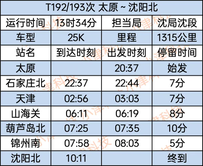 太原站至沈阳北站T192/193次运行13小时34分,太原站20:37始发,经停石家庄北、天津、山海关、葫芦岛北、锦州南站,次日10:11终到沈阳北站。