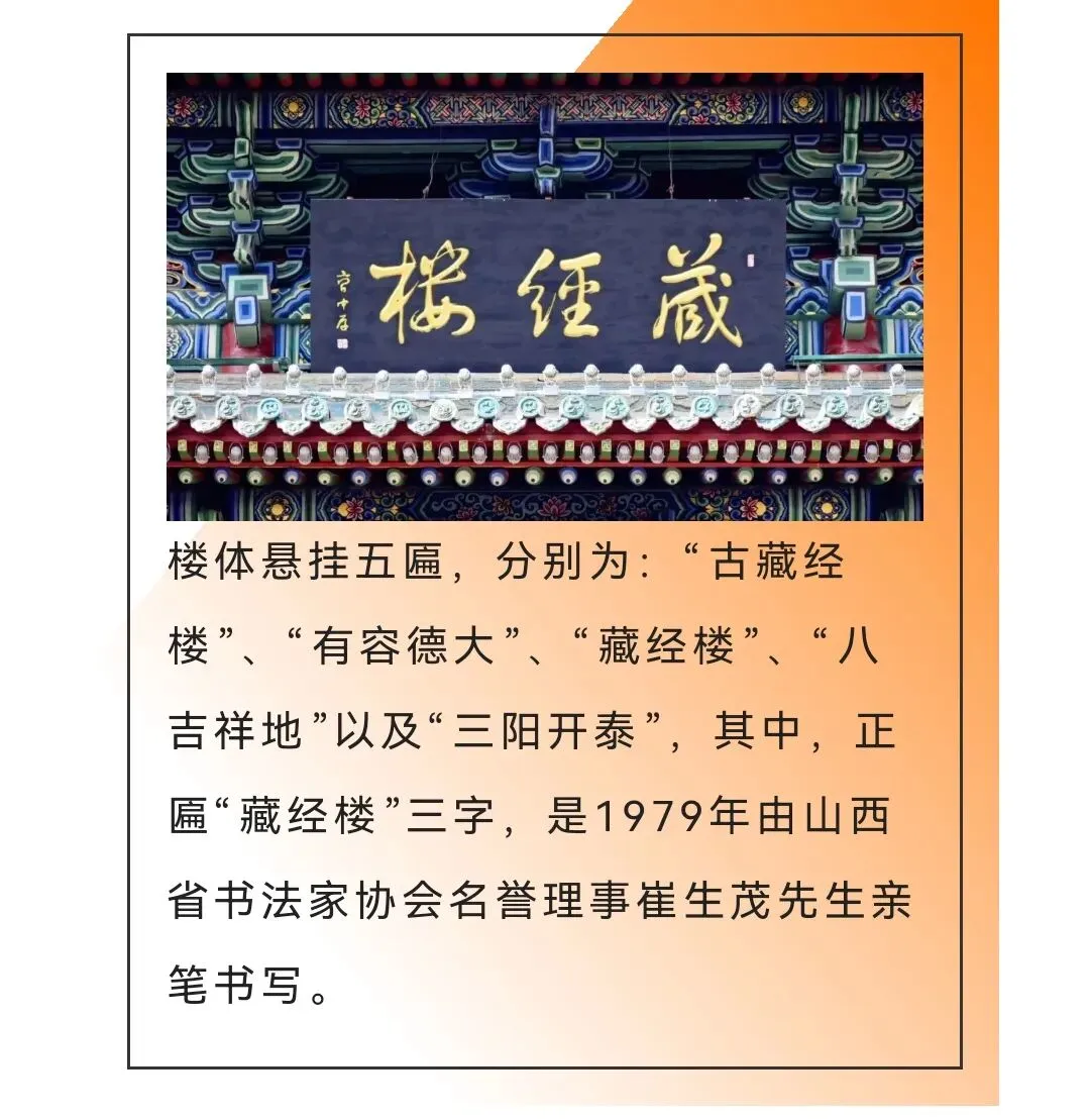 · 三层:最上方的匾额则为“古藏经楼”,由山西大学国学大师姚奠中老先生题写。
