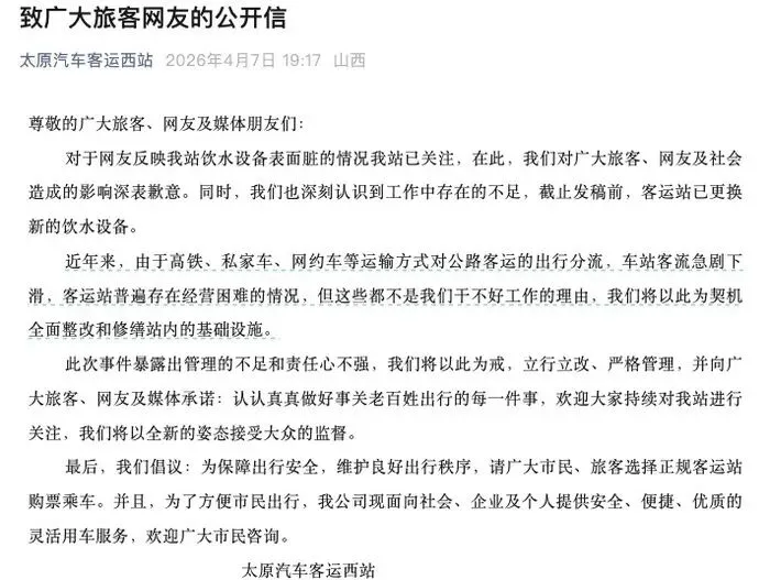 记者注意到,7日晚间,太原汽车客运西站就此事发布《致广大旅客网友的公开信》,信中称,“对于网友反映我站饮水设备表面脏的情况我站已关注,在此,我们对广大旅客、网友及社会造成的影响深表歉意。同时,我们也深刻认识到工作中存在的不足,截至发稿前,客运站已更换新的饮水设备”。