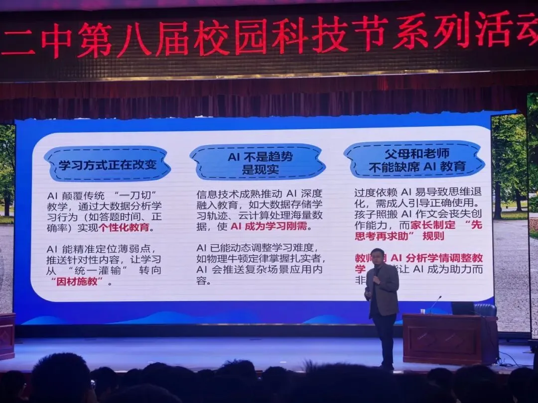 “书香太原·锦绣讲坛”走进太原市第十二中学。活动特邀复旦大学中国研究院副研究员、数字经济学者刘典教授,在学校第八届校园科技节中开展以“AI赋能学习”为核心的专题讲座。讲座系统讲解了AI对教育的变革、学科应用、使用误区与能力培养,引导师生科学运用人工智能,以科技赋能学习、助力成长。