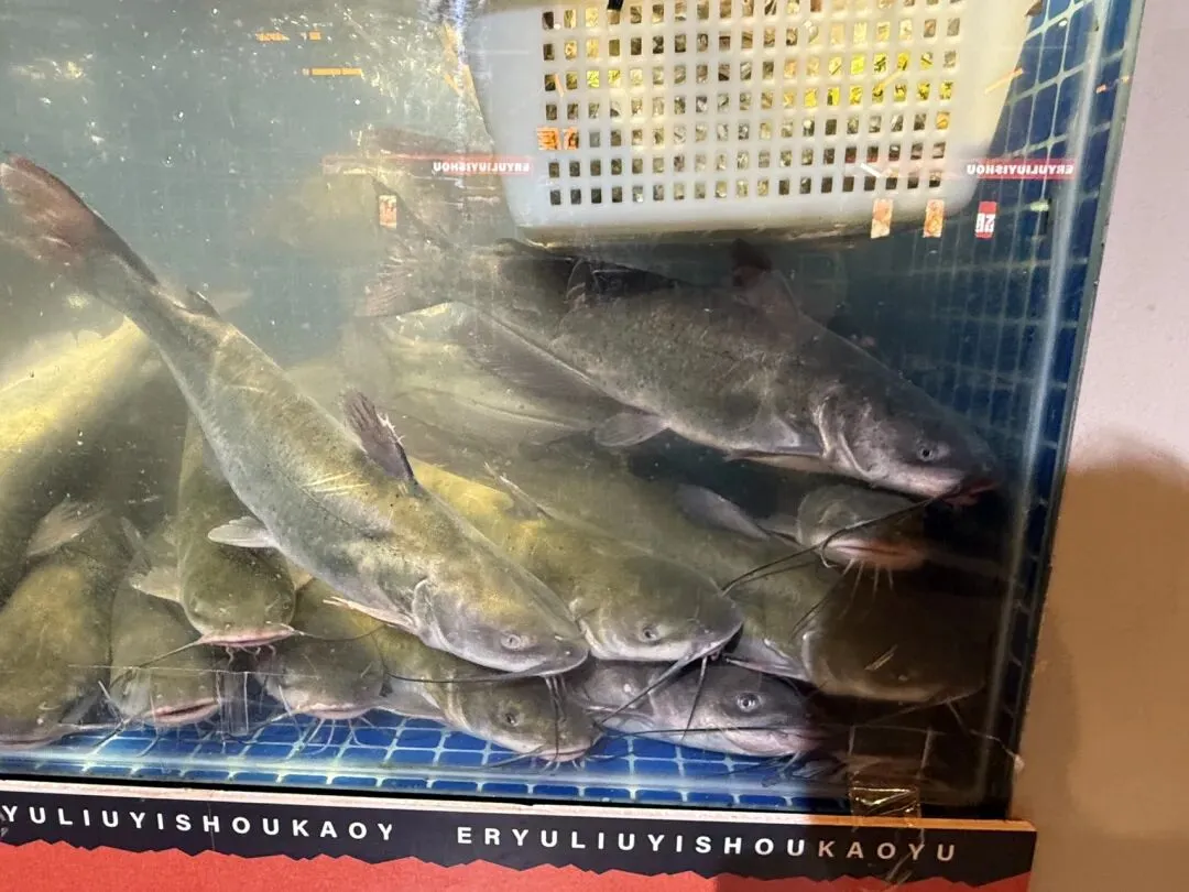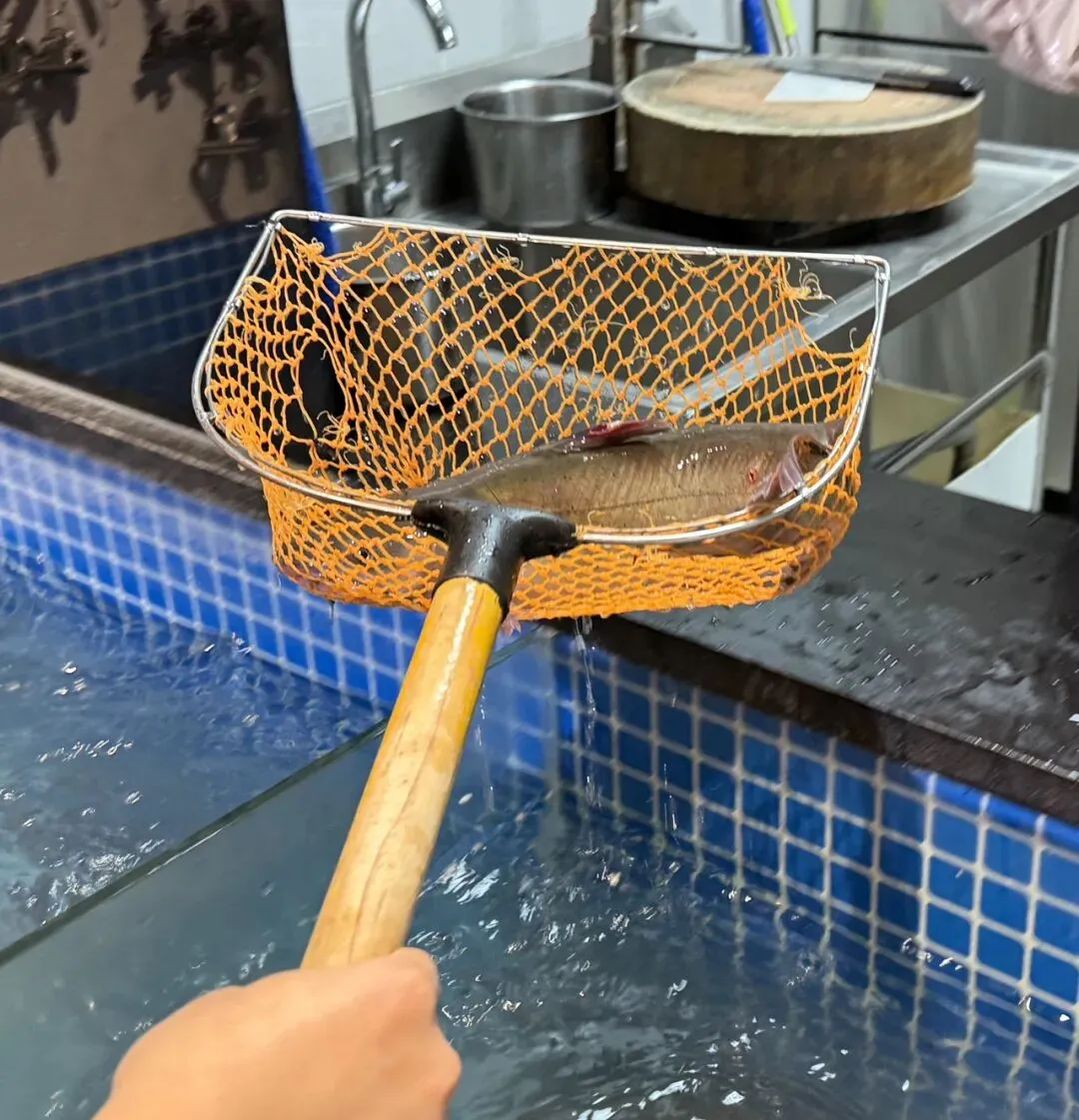 师傅从鱼缸里捞出一条活蹦乱跳的江团,现杀、现烤,全程透明。江团刺少肉嫩,几乎吃不到小刺,老人小孩都能放心大口吃。