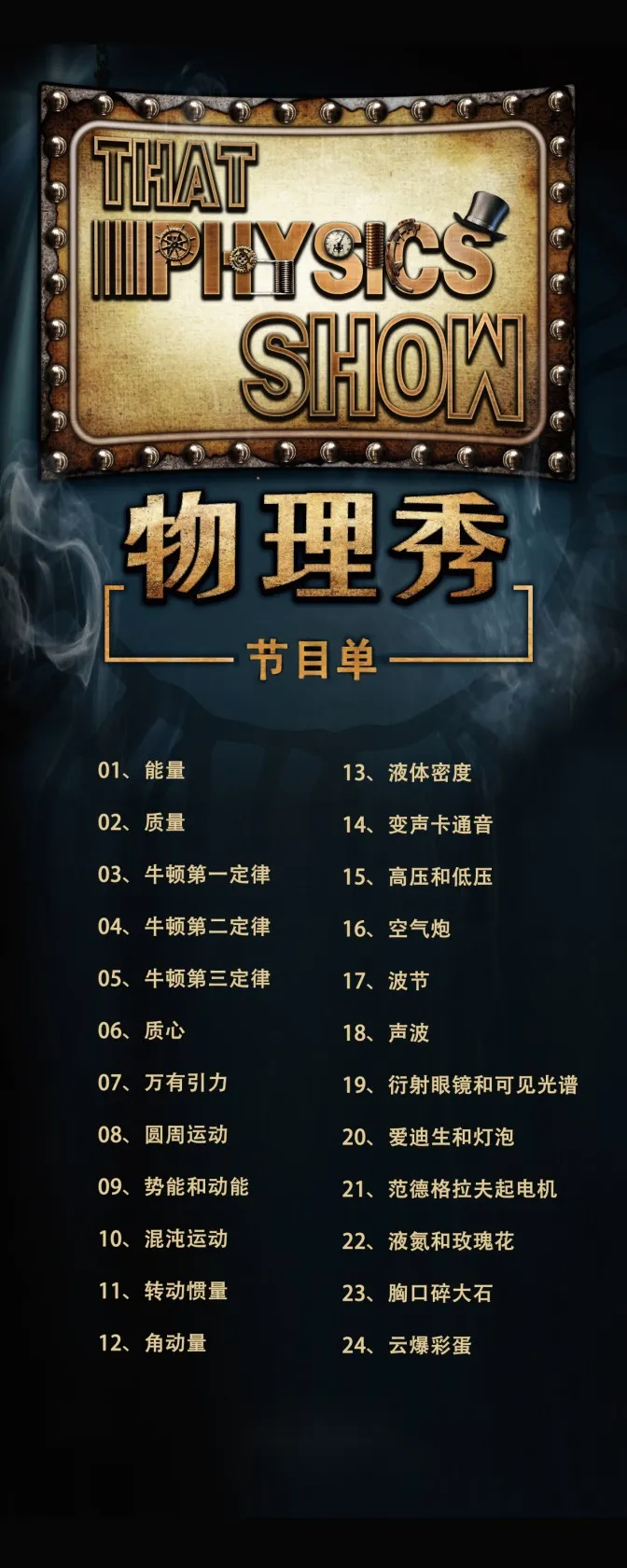 灭火器、自行车轮、可口可乐…日常所见的物品在物理法则之下,都能展现出非凡的魔力效果!舞台的主角不再是小丑和公主,而是主宰大千世界的牛顿法则、守恒定律、光电效应……这就是让无数人爱上科学的百老汇互动亲子科学剧《物理秀》!