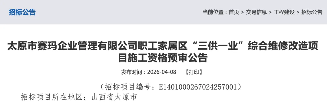 目前,太原的老旧小区改造大多是在原有建筑结构基础上进行功能提升和外观修缮,兼顾安全与民生:1、2020—2025年太原完成3497个老旧小区、1.46万栋楼、64.4万户改造,多为1978—1995年建成、6层砖混、无电梯,集中在迎泽、杏花岭、万柏林、尖草坪等老城区;2、截至目前,2026年太原已公布迎泽区225个老旧小区庭院供热、供水管网更新改造;万柏林区53个老旧小区供热二次管网改造工程;小店、万柏林、尖草坪、晋源4区共169个老旧小区燃气管网改造;以及阳曲县6个老旧小区基础改造等。1、近日,全国公共资源交易平台发布了《太原市赛玛企业管理有限公司职工家属区“三供一业”综合维修改造项目施工资格预审公告》:项目规模:本项目地址位于山无宿舍区(迎春街19、21号)、乐器所宿舍(桃园四巷24号),2个职工家属区内。建设内容:本次改造项目共涉及2个小区,21栋住宅楼,住户587户。包括沥青路面硬化、面包砖路面更新、散水更新、新建非机动车车棚楼体屋面防水翻新、1#楼外墙和围墙整修涂料翻新、楼宇门对讲更换、绿化修剪、地下室防水更新、门禁道闸更换、增设垃圾桶和宣传栏、增设标识标牌和健身器材、停车位划线增设电动自行车充电桩、户内污水管及出户污水管更换、公用雨污水管网更换、检查井和化粪池更换、弱电井和监控更换、增设室外微型消防站和成品桌凳等;新建电缆井、电表箱和小区强电电缆更换、车棚供电电缆和道闸供电电缆敷设等。不含建筑节能改造。2、《太原裕泰企业管理有限公司职工家属区“三供一业”综合维修改造项目施工资格预审公告》项目规模:位于太原市小店区东岗路243号大华东宿舍、太原市小店区寇庄北街10号大华西宿舍、太原市迎泽区体育西路20号大华北宿舍。