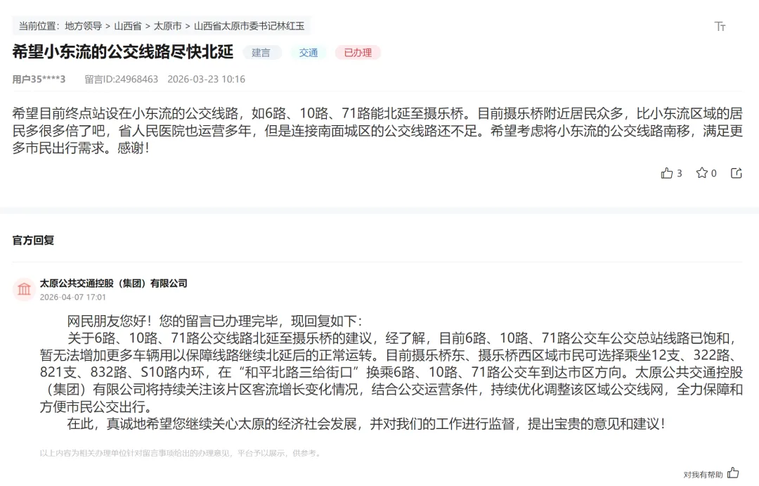 对此建议,官方回复称:经了解,目前6路、10路、71路公交车公交总站线路已饱和,暂无法增加更多车辆用以保障线路继续北延后的正常运转。目前摄乐桥东、摄乐桥西区域市民可选择乘坐12支、322路、821支、832路、S10路内环,在“和平北路三给街口”换乘6路、10路、71路公交车到达市区方向。太原公共交通控股(集团)有限公司将持续关注该片区客流增长变化情况,结合公交运营条件,持续优化调整该区域公交线网,全力保障和方便市民公交出行。