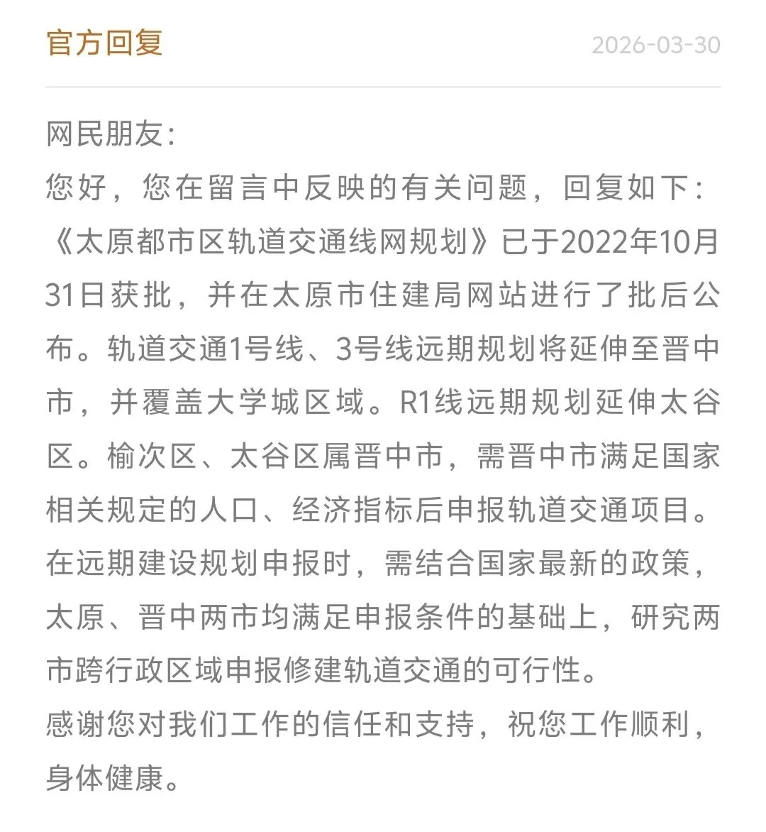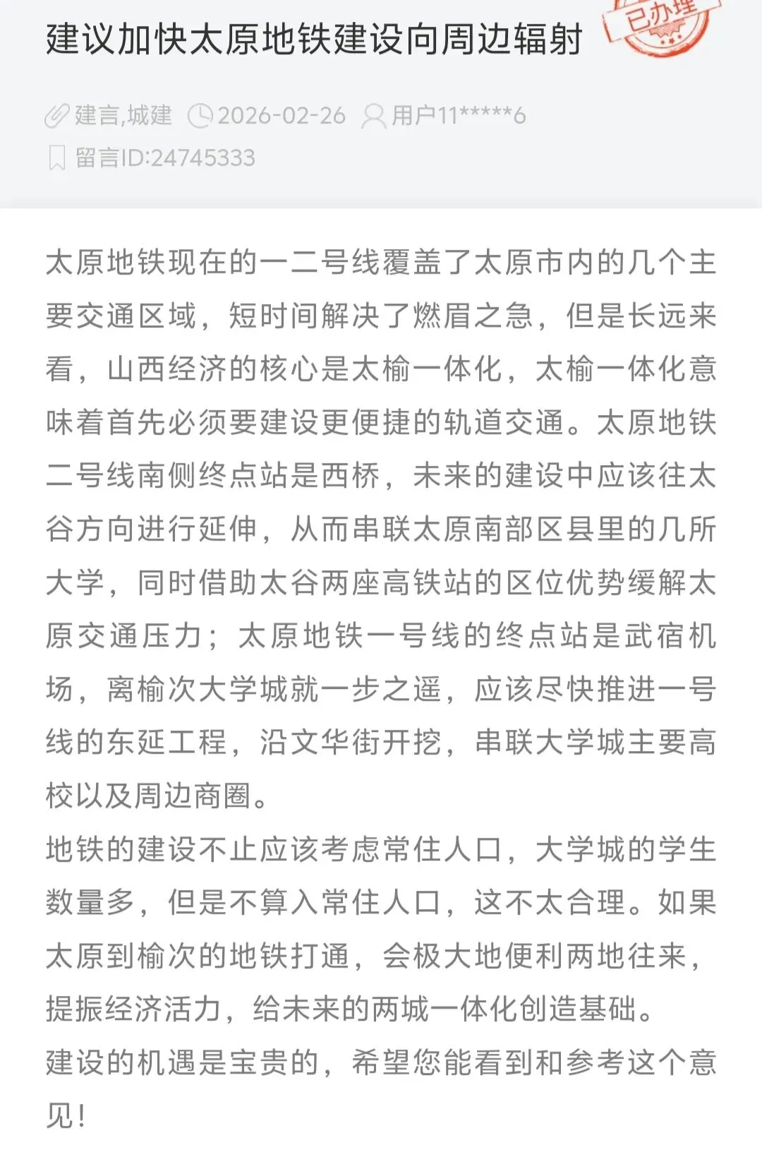 针对该建议,太原市相关部门于2026年3月30日正式回复: