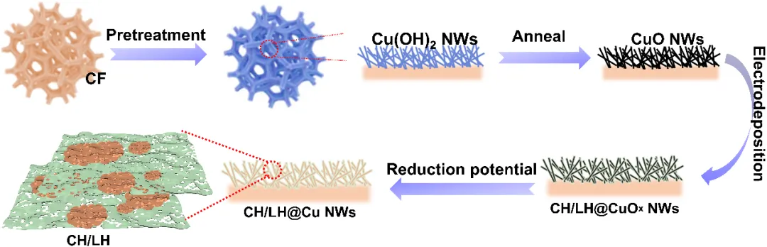 图1为CH/LH@Cu NWs的合成示意图。通过化学预处理在泡沫铜CF上均匀生长直径为200 nm的Cu(OH)2 NWs,在180 °C空气中退火2小时后,得到了形貌保存完好的CuO NWs,并将其直接用作电沉积的工作电极,进一步得到CH/LH@CuOx NWs;随后,在1 M KOH中对CH/LH@CuOx NWs施加一个恒定还原电位,持续一段时间,获得CH/LH@Cu NWs样品。