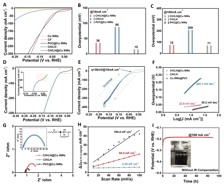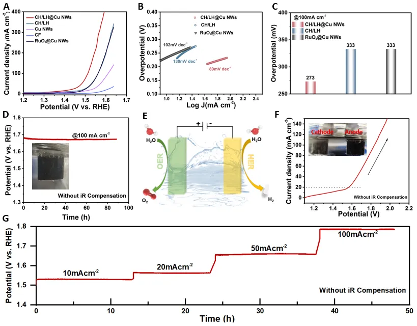 CH/LH@Cu NWs表现出优越的HER性能,在10 mA cm−2电流密度下的过电位为36 mV,其Tafel斜率为22.9 mV dec−1;此外,CH / LH@Cu NWs显示了非凡的碱性OER性能,在100 mA cm−2电流密度下的过电位为273 mV。这归因于CH/LH@Cu NWs异质结构中大量的纳米级界面和孔隙所导致的强烈电荷转移。