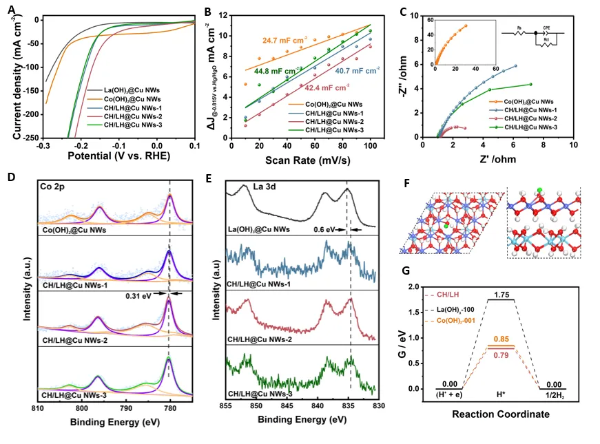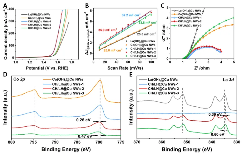 太原理工大学郭俊杰教授和章海霞副教授在国际知名杂志Journal of Materials Chemistry A上发表题为“Interface engineering of porous Co(OH)2/La(OH)3@Cu nanowires heterostructure for high efficiency hydrogen evolution and overall water splitting”的研究成果。该文章在铜纳米线上构建了多孔氢氧化钴和氢氧化镧异质结构 (记为CH/LH@Cu NWs)。