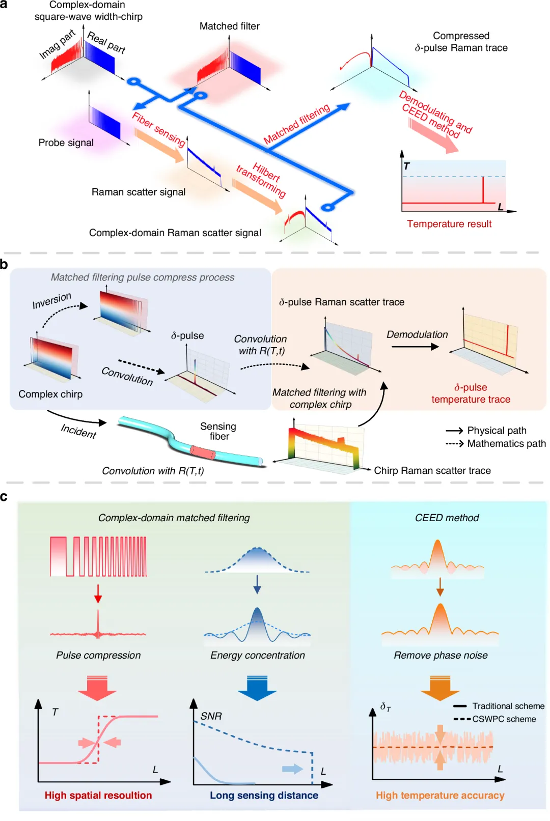 图1 CSWPC 传感方案及基于物理机制的温度解调原理。 a, CSWPC 传感方案; b, 通过复数域匹配滤波获取 δ 脉冲拉曼散射轨迹及其对应温度分布的物理原理; c, CSWPC 方案同时提升空间分辨率、传感距离和测温精度的原理示意。 其中,R(T,t) 表示拉曼特征方程,CEED 表示复数域包络提取去噪(complex-domain envelope extraction denoising)。