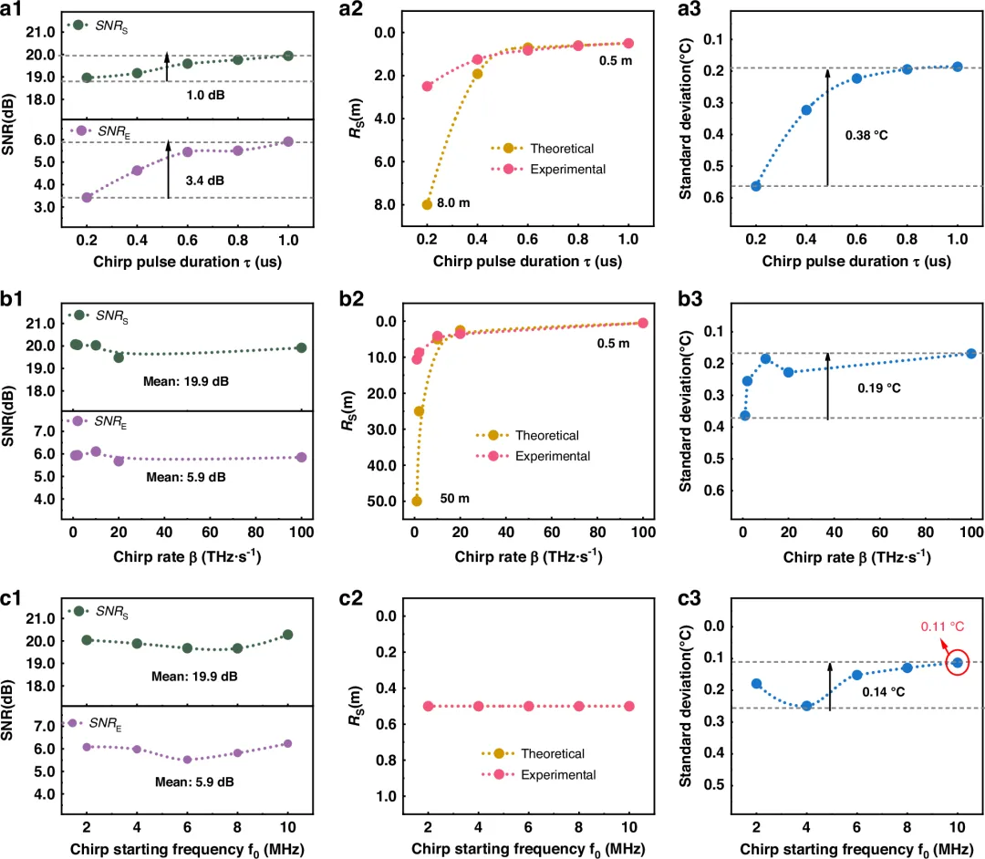 图3 CSWPC 方案的空间分辨率 R s 示意图。图4 不同方案下的有效传感距离与测温精度。 a, 不同方案在有效传感距离处的信噪比(SNR); b, 不同方案的测温精度。图5 不同环境温度下 FUT 对应的分布式温度解调结果。 a, 温度解调曲线; b, 测温精度及误差棒。图6 不同啁啾参数对传感性能的影响。 a, 不同啁啾脉冲宽度下的性能变化;a1, 信噪比(SNR);a2, 空间分辨率;a3, 测温精度。 b, 不同啁啾速率下的性能变化;b1, 信噪比;b2, 空间分辨率;b3, 测温精度。 c, 不同起始频率下的性能变化;c1, 信噪比;c2, 空间分辨率;c3, 测温精度。声明:本文旨在传递和分享科研资讯,仅供个人学习、参考和学术交流之用,不作商业用途。文中引用的文献已注明相关来源。由于水平有限,内容解读可能存在不准确之处,如有任何问题或涉及知识产权保护等情况,请及时通过邮箱fiber_optic_sensor@126.com与我们联系,我们将尽快协调处理。如有宣传需求,欢迎将相关材料发送至邮箱:fiber_optic_sensor@126.com。