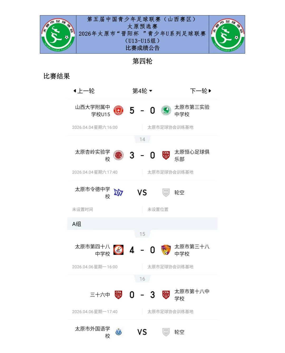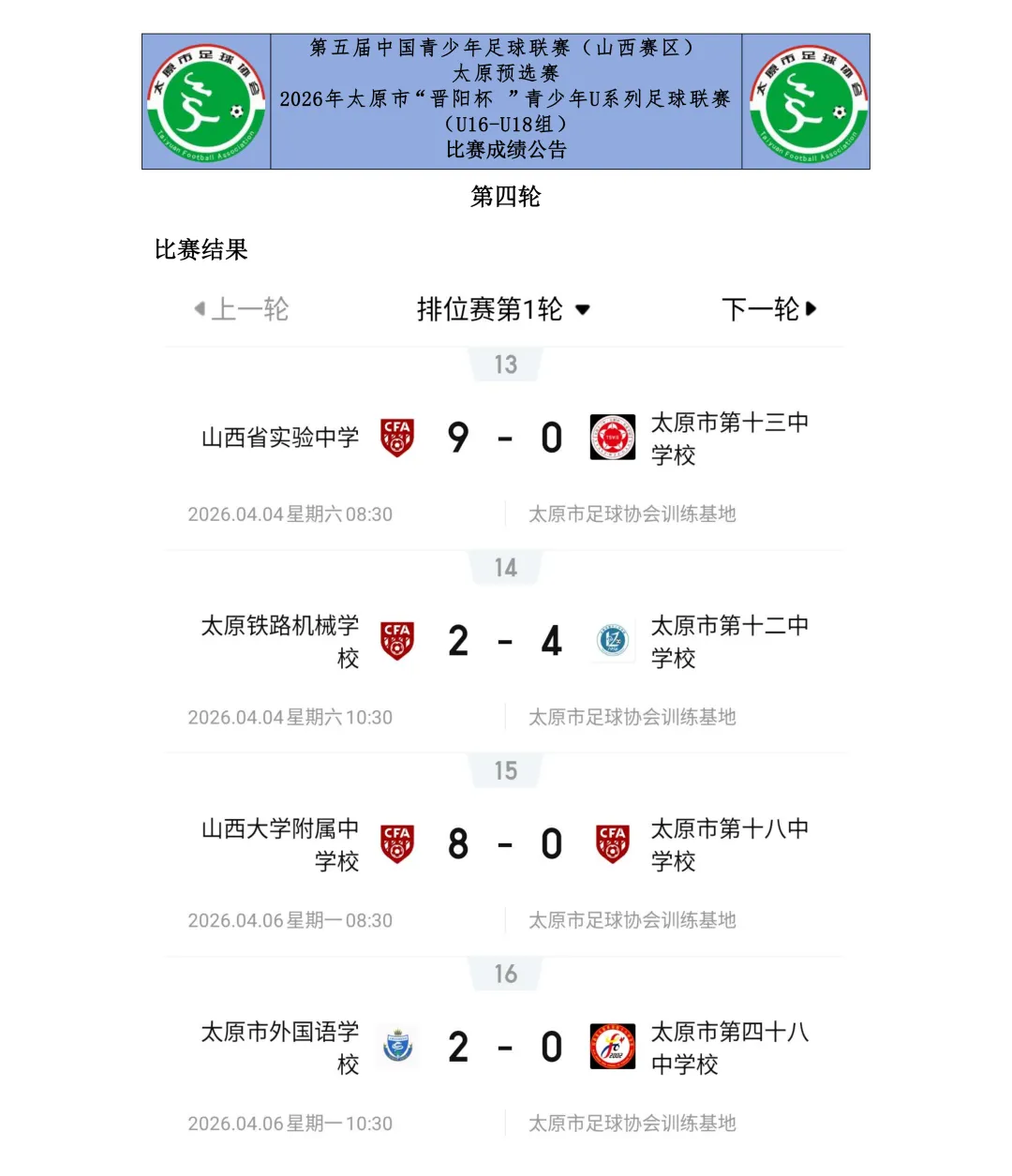 4月4、6日,第五届中国青少年足球联赛(山西赛区)太原预选赛2026年太原市“奔跑吧·少年”足球赛“暨晋阳杯”青少年U系列足球联赛第四轮比赛在太原市足球协会训练基地继续进行。各队为更好的排名继续奋力拼杀。