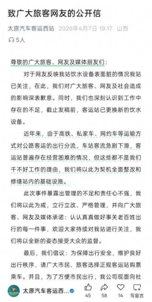 连日来,山西太原汽车客运西站因饮水机满是污垢遭到吐槽一事引发热议。4月7日晚,该站公开发文致歉,并称已更换新的饮水设备,将以此为契机全面整改和修缮站内基础设施。
