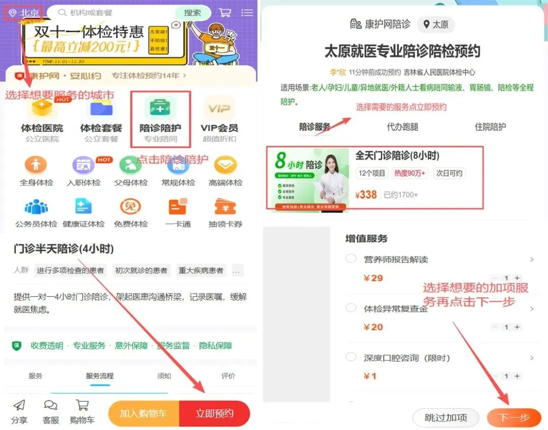 ③按需选择【具体的陪诊服务】进行预约,并填写信息及陪诊时间