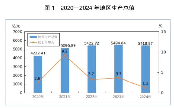 经济增长:初步核算,全市实现地区生产总值(GDP)5418.87亿元,比上年增长1.2%。其中:第一产业增加值47.85亿元,增长3.5%;第二产业增加值1666.71亿元,增长0.1%;第三产业增加值3704.31亿元,增长1.6%。三次产业增加值占地区生产总值的比重为0.9%、30.7%、68.4%,分别拉动经济增长0.03、0.05和1.12个百分点。人均地区生产总值98803元,按2024年平均汇率计算为13874美元。