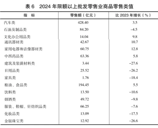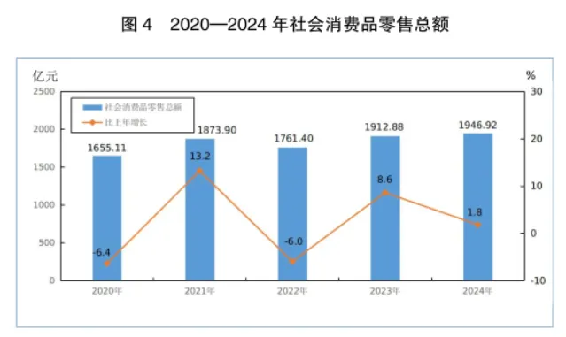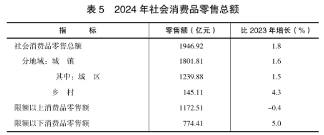 消费品零售:全年社会消费品零售总额1946.92亿元,比上年增长1.8%。其中:城镇社会消费品零售总额1801.81亿元,增长1.6%;乡村社会消费品零售总额145.11亿元,增长4.3%。